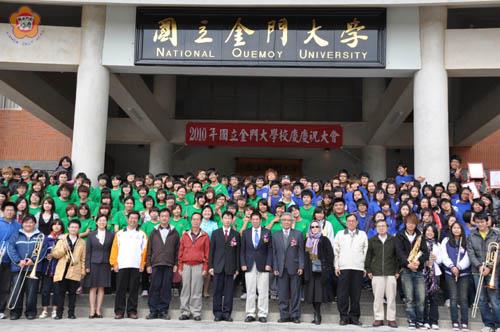 國立金門大學昨天舉行改制大學後首次校慶,金門縣長李沃士專程前至祝賀,同時許下在他任內將全力促成金大成為兩岸「一流學府」心願;李金振特別致贈感謝牌給「創校校長」黃廣志,並勉勵學子「飲水思源」心存感恩;另外一連串的精彩迎新舞蹈表演與創意校歌比賽,校園盈滿喜氣洋洋。 金門大學校慶典禮昨上午8時30分假星型廣場盛大登場,包括金門縣長李沃士、金門國家公園管理處副處長盧淑妃、金防部政戰副主任吳福國在內貴賓到場祝賀,「創校校長」黃廣志特別回校接受全體師生的感恩與感謝。縣議長王再生、副議長許建中,立委陳福海等各界也贈花籃道賀。 「生日快樂!」李縣長應邀致詞時,首向國立金門大學升格後首屆校慶表達衷心祝福與賀喜心意,對「金門大學」從借用高職農場教室開始,迄今日改制大學的規模,一路走來,歷盡艱辛歲月。他尤感謝金門大學前身高雄應用科技大學校長黃廣志在金門設分部、以及各界師長努力與奉獻,彌足珍貴。 對來到金門求學的學子們,李縣長也說一聲:「謝謝你們!金門因為有你們到來,金門倍增光采與充滿朝氣活力」,也讓台灣及兩岸朋友更加認識金門,「金門招牌」之所有今天的響亮,是所有海外金門僑親、台灣金門鄉親、曾在金門服過兵役的好朋友,以及曾在金門待過對金門有貢獻的人,大家共同把它「擦亮」的。 李縣長視學子們有如新一代金門人,他相信學子們在金門經過3、4年歷練後,對金門將有深厚情感,他期盼「新金門人」加入擦亮金門招牌的行列。李縣長也以同樣心情期待大陸地區的學生到來。他期許大家以金門人為榮,將來不論留在金門,抑是離開金門,金門永遠都是值得懷念的心靈故鄉。 「金門大學」今年8月1日誕生。李縣長說:「也是擔子與責任加重」,他期待在大家繼續努力促使金門大學發展成為國內一流學府,同時在兩岸之間打出亮麗的招牌;將來金門因「金門大學」而有名、金門大學也會因有金門所有鄉親作為「後盾」,以及縣府全力的支持力量,將放眼天下、立足兩岸發光發亮。 金門大學校長李金振言簡意賅說明改大過程,在13年內分五階段、換了五個校名、至今大功告成,主要歸功先民努力及前輩貢獻,成功打造「金門」的金字招牌;其次教育部准予「補學分」再畢業通融作法;再則「創校校長」黃廣志無怨無悔開路披荊斬棘衝先鋒,尤功不可沒。 對「金門大學」創校能大功告成,李金振說:「這是所有金門人的大團結」,不論是海外華僑,抑是台金學人,再加上各界有錢出錢、有力出力,尤其是金門縣政府挹注給大學基金10億,眾志成城。他勉勵學子要「飲水思源」心存感恩;金門大學是「有所本」,他十分推崇當年黃廣志堅持與執著,才有今日成果。 李金振也引領貴賓及師生校園巡禮,共同緬懷創校艱辛歷程,同時在綜合大樓門口拍大合照,並偕同黃廣志、鄭愁予伉儷及全體師生合切生日蛋糕,同聲歡唱「生日快樂!」,祝賀校運昌隆,再創光輝歷史。 創校校長黃廣志以「金門高等教育的開創」為題作專題演講,回顧金門技術學院獨立設校歷程,並期許金門大學更發揚閩南、僑鄉、戰地、海島等文化特色,再創光輝校史。金大慶祝校慶安排迎新毛毛蟲舞優勝隊伍表演及創意校歌比賽,學生載歌載舞展現才藝,校園內熱鬧滾滾。