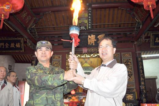 金門縣第十七屆運動會將於十一月四日至六日展開競技,昨天在奉祀「恩主公」陳淵的三級古蹟牧馬侯祠舉行聖火點燃儀式,由縣長李沃士、金防部指揮官張慶翔中將共同點燃聖火,並展開全縣各鄉鎮傳遞,向軍民傳達運動會四日開幕的喜訊。 金門縣第十七屆運動會聖火點燃儀式昨日上午八時在台閩地區三級古蹟的金城鎮豐蓮山牧馬侯祠舉行,由李沃士、張慶翔共同擔任主獻官,率地方鄉老、各界首長、學校校長和學生代表向「恩主公」陳淵神像上香、行三獻禮後引燃聖火,並交由聖火隊展開全縣遶行傳遞。 今年聖火由軍政雙首長共同引燃,是歷年縣運會首見,縣運會籌備委員會表示,早期縣運會為軍民共同參加,民國81年戰地政務終止、軍民分治才喊停,這屆縣運會重設軍中組,邀請軍方共襄盛舉,彰顯軍民一家的傳統友誼與精神。 縣長李沃士致詞表示,今天齊聚開浯恩主公尊前舉行金門縣二年一度的縣運會聖火點燃典禮,首先感謝各界代表盛情參與、踴躍參加。李縣長說,縣運會今年邁入第十七屆,非常高興在體育界前輩支持努力下,一屆比一屆有更好成績,今年縣運會也特別邀請軍方來共襄盛舉,也邀請身心障礙朋友一起加入運動的行列。他說,運動是健康的一項象徵,尤其現在國人營養過剩狀況,平常有機會應多做運動,相信對身體健康是有幫助,有益健康。 他說,運動精神也很重要,可激勵人心,不管在毅力的培養、企圖心的培養都是好方式,同時鼓勵鄉親平常多運動,年輕朋友透過運動培養出自己新的人生觀,相信透過運動定可以讓社會、國家更加強盛、更加具有健康環境。更期待大家同心協力,讓金門體育更加蓬勃發展,也祝福運動大會圓滿平安完成,結果非常圓融。 張慶翔除了為大會秩序冊題字「強身報國」外,並祝賀大會一定成功,軍民身體健康。 運動會聖火引燃後,由寧中小組成的聖火隊展開金門繞行,擔任聖火組長的許維民校長率子弟兵依聖火傳遞路徑,沿途經各鄉鎮、學校或街道為傳遞路線,全程播放錄音帶作為聖火行進間之音樂,並依照「奧林匹克火炬傳遞方式」僅以一人執主火遞跑為原則,副火六人展開傳遞,上午由牧馬侯祠經金湖鎮、金沙鎮、金寧鄉、金城鎮,中午至縣立體育場休息,下午再繞行烈嶼鄉後傳到金門縣立運動場。 以「海洋仙洲、精采金門」為主題的金門縣第十七屆運動會,將於四日下午六時在縣立運動場開幕,展開三天比賽。這屆縣運會除了社會組、高中組、國中組、國小組外,新增軍中組、身心障礙組,進行田徑、游泳等十三項目展開競技,參與選手、工作人員達8079人,人數和規模為歷屆之冠。 (相關新聞見二、三版)