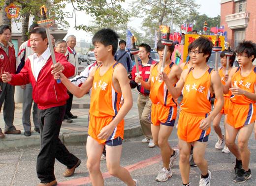 張建騰/圖文 金門縣第十七屆縣運會的聖火昨日傳遞到金湖鎮;金湖鎮鎮長蔡西湖率領公所各課室主管前往迎接。 金湖鎮公所將於十一月六日晚上六點舉辦慶功宴,希望選手們在縣運會中全力以赴。
