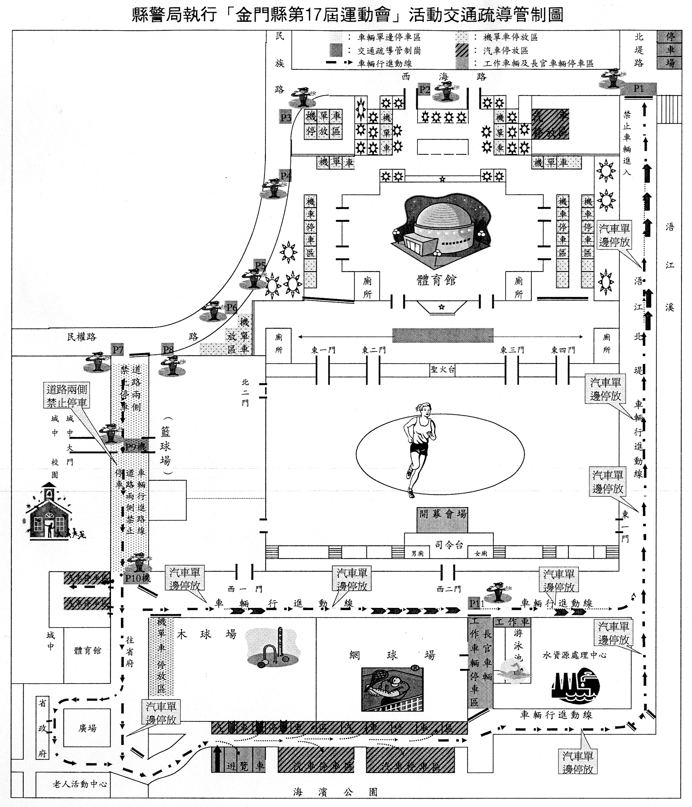 金門縣第17屆運動會將於明(4)日起一連三天於縣立體育場舉行,為維護縣運會期間體育場周邊道路的交通秩序順暢與人員、車輛行的安全,縣警局將實施交通疏導與管制,並請前往參加及觀賞比賽之地區民眾及行經該路段之駕駛人配合交通人員之指揮行駛。 縣府為發展全民體育運動,提高運動技術水準,並鼓勵全民積極參與運動,養成終身運動文化,舉辦二年一度的全縣運動盛會,預估前往參加及觀賞競賽之選手及地區民眾將不在少數,比賽期間所帶來之人潮及車輛勢必會影響到周邊道路之行車秩序,縣警局將從縣運會當(4)日上午7時起至6日下午7時止針對運動場周邊道路實施交通疏導及管制,其原則如下: 運動場周邊道路行車動線採單向通車方式實施,即汽機車一律從民權路進入城中前路段駛入,並沿著運動場周邊道路往南門海浯江北堤路方向駛出;惟開幕暨晚會期間11月4日16時至21時及閉幕期間11月6日16時至19時城中前道路管制禁止任何車輛進入。 汽車可停放於浯江北堤停車場,或由民權路進入城中前道路後繼續往前,惟駛入時務必減速慢行,將車輛停放於城中體育館前空地、海濱公園停車場、北堤停車場,或依序於省府前廣場周邊、運動場西側道路、游泳池水資源處理中心等周邊道路順向單邊停放。 機車及腳踏車禁止停放於城中前兩側道路,將車輛停放於體育館前左側停車場、稅捐處對面空地,或駛入體育場內將車輛依序停放於體育館兩側道路,停滿後則依序停放於體育館前道路,嚴禁駛入體育場與運動場中間廣場之煙火施放區停放。 遊覽車於乘客下車後,一律將車輛停放於北堤路大型車路邊停車格內、或海濱公園大型車停車場。 管制區內除城中前道路兩側禁止停車外,其餘道路開放單邊停車,惟對向車道路邊一律禁止停車,轉彎處及路口一律嚴禁停車;周邊道路嚴禁擺設攤位。 體育場前空地開放供民眾上下車,惟嚴禁於該處停車。 會場周邊道路民族路、民權路、北堤路、西海路及城中前道路等,嚴禁違規停車。 開幕晚會結束散場時,配合人、車潮於西海路、北堤路口進行交通號誌管制,以維人車安全。 縣警局局長柯昌良也呼籲地區民眾配合縣運會期間之交通疏導與管制,並請城區民眾儘量不要駕駛自用車前往,儘量以徒步或機車等方式前往運動場。另外,民權路進入城中的下坡路段,預計縣運會期間人潮流量多,亦請行經該路段之車輛減速慢行,避免造成交通事故。