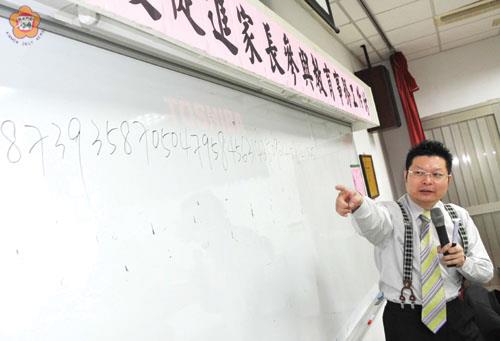 四十個阿拉伯數字亂碼,怎麼能夠速記並做到正背無誤,倒背如流,抽背精準?中華民國全腦記憶協會執行長張耀宗(見圖,張建騰攝)昨天在金湖國中小露一手,讓家長們覺得神乎其技。 張耀宗是能在三分鐘內牢記六十個數字的記憶奇人;昨天,金湖國中「家長參與教育事務工作坊」中講授「如何協助小孩找到讀書方法,增加學習興趣及成績」。 他的授課大綱包括:「終身學習VS終身有效學習」、「有效學習的方法」、「如何從學習中吸取他人的經驗及智慧,進而提升競爭力」、「記憶力=學習力=競爭力」、「快速記憶秘訣教學」。 他在演講中請十位家長各提供四個隨機、毫無次序的阿拉伯數字亂碼;他很快就記住了這四十個數字,正背、倒背都可以,還可以隨意抽背第幾位數是什麼數字。 張耀宗的表演是為了指導家長們怎麼訓練記憶;他提供的方法包括:圖像法、聯想法和位置法。 位置法的原理是先建立已知的位置,再用想像力去連接未知的事物。聯想法是把沒有關聯的事物關聯起來。圖像法則是把左腦難記的數字或文字,轉成右腦容易記憶的圖像。