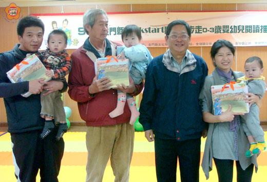文化局「BOOKSTART」閱讀起步走活動列車,昨日上午九時起開抵金沙鎮,吸引兩百五十位親子及祖孫參與,會場充滿逗趣畫面與歡笑氣氛。文化局局長李錫隆到場為參賽兒童加油,並告訴家長幼兒閱讀的重要性。現場兩項比賽分別由張翃昱、陳柔安拔得頭籌。 金門縣文化局巡迴五鄉鎮辦理「BOOKSTART」閱讀起步走活動,昨日上午九時起假金沙鎮公所三樓會議室舉行,現場贈送幼兒閱讀禮袋給一百位六至二十四個月嬰幼兒家長,文化局局長李錫隆到場與金沙圖書館管理人員黃素萍等向家長推廣幼兒閱讀的重要,鼓勵家長陪孩子一起閱讀。 李錫隆提醒家長,不要忽視嬰幼兒閱讀的重要;並引述國外研究顯示,自幼建立閱讀習慣,有助於提昇兒童的學習力,故文化局今年特別結合各鄉鎮公所圖書館,來推廣這項國家百年大計活動;藉此鼓勵家長與孩子共享閱讀樂。 該活動共分為兩部份,包括「閱讀禮袋」贈書活動以及寶寶比賽活動,其中寶寶比賽又分寶寶爬行賽及寶寶搬尿布比賽,昨日現場吸引兩百五十位親子及祖孫參加,寶寶場上競賽,家長場邊歡呼指揮,好不熱鬧,經過一番激戰,由張翃昱及陳柔安榮獲第一名,得獎名單如后: 寶寶爬行賽,第一名張翃昱、第二名翁妍華、第三名黃遠燊。大力士搬尿布,第一名陳柔安、第二名李羽臻、第三名蔡雨樂。