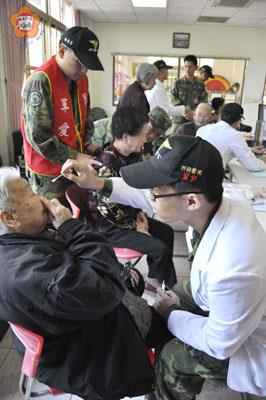 聯勤金支部野戰醫院,昨日上午九時到大同之家服務長者,院長林金皇率領醫官群為長輩提供西醫內外科、牙齒口腔保健、復健推拿等衛教諮詢,計有四十八人參與,最高齡為九十八歲的董子玉。年逾九旬的周正治說,謝謝國軍為她量血壓、復健治療,讓她身子頓時輕鬆很多。 聯勤金支部金門野戰醫院,昨日由院長林金皇帶隊,於上午九時至十一時,至大同之家義診,提供平常保健以及多元醫療服務,參與成員包括,王貫宇(西醫)、廖宏達(西醫)、蔡坤成(西醫)、陳政瑋(牙醫)等四位醫官及復健師陳昭宏和醫務兵古秉翰(護理)等。 阿兵哥義診,大同之家長者笑開懷,頻頻道謝,讓服務的國軍弟兄深受感動。醫護人員表示,她(他)們有的因為季節轉換皮膚癢;有的因為舊傷成風濕;有的則有慢性症狀;依年齡而論大致都十分健康;現場為其進行一般保健如量血壓,提供衛教諮詢並由復健師陳昭宏為阿公阿嬤提供物理治療、牙醫為長者檢查口腔等。 野戰醫院院長林金皇表示,聯勤金門野戰醫院依聯勤司令部及聯勤金支部之指導,自九十七年起編組西醫、中醫、牙醫、護理、復健及公共衛生等專才成立社區義診服務隊,於戰備之餘利用時間下鄉至各社區為民服務,提供全方位保健諮詢給金門鄉親,特別在秋冬交替之際,老人心血管疾病好發季節,前進大同之家為長者服務。 聯勤金支部也表示,社區義診服務隊將持續到府關懷民眾健康及提供弱勢族群醫療諮詢服務,各界若有需求可與地支部、野戰醫院聯繫,聯絡電話334452地支部、334113野戰醫院。