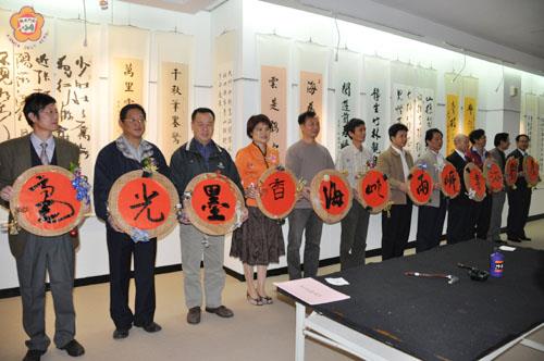 2010年「毫光墨香│海峽兩岸書法家聯展」,昨舉行溫馨開幕茶會,縣文化局長李錫隆代表縣長祝賀兩岸書法聯展展出成功。兩岸書法家當場揮毫,各家筆上功夫獨到,贏得滿堂喝采聲。在文化局一樓展覽廳展出2百幅書法作品、展期將至11月3日止,金門縣書法學會理事長洪明燦歡迎各界前至鑑賞。 「毫光墨香-海峽兩岸書法家聯展」,自10月23日在金門縣文化局一樓展覽廳登出,因受颱風攪局,開幕茶會延至昨天上午11時舉行,與會出席貴賓冠蓋雲集,包括金門縣書法學會、高雄市國際文化藝術協會、廈門市閩台書畫院、廈門市書協、漳州市雲霄縣文聯、河南省新鄉市書協等兩岸6地書法團體。 縣文化局長李錫隆在開幕茶會中特別表達李縣長關心兩岸書法家所推出的書法作品聯展並獻上祝賀。李錫隆同時介紹金門縣近年來致力藝文活動推展,不論是藝文展,抑是出版鄉土文物等圖書,均不遺餘力,並獲文建會等多項獎項與殊榮,他期望兩岸在藝文多交流學習。 漳州市雲霄縣文聯會主席何明坤對此次受邀來金門聯展,他說,金門在他的心目中是座「美麗的島嶼」,這次能來金門是他盼望多年心願,終如願以償,令他相當興奮;他認為,兩岸書法聯展有助兩岸書法的交流與傳承,冀望今後能與金門藝文界多學習與了解,共促成中華文化的精進與發揮光大。 縣書法學會理事長洪明燦說,馬總統及夫人周美青曾在多次場合中提及學習書法的重要性,其深具潛移默化、振奮人心功效;其次,洪明燦也分享赴杭州進修書法成果,以及領略簡體、繁體字書寫之不同;他期望在所有理監事及會員「用心」推動書法,使書法生活化,進而帶動全民愛好書法的風氣。 高雄巿國際文化藝術協會洪條根則以其書寫一副「金湯鐵堡砲等閒、兩岸情仇化雲、交流反攻皆前哨、酒香烽火飄同天」墨寶作品,把它當作一首詩,並現場「吟唱」起來,用以詮釋兩岸追求和平、愛好和平的象徵,他鏗鏘有力又充滿情感吟詩,獲得貴賓熱情掌聲喝采。 洪明燦、李錫隆、陳炳仁、孫國粹等等兩岸書法家,並現場揮毫,為2010年「毫光墨香-海峽兩岸書法家聯展」增添文化氣息,也展現豐富的人文藝術。洪明燦分別贈送感謝狀予參展的大陸、台灣的書法團體,以及感謝縣書法學會全體理監事及會員同心協力促成此次聯展與交流,意義非凡。 金門縣書法學會現有近百位會員,大部份服務於教育界、行政界及退休公教人員,理事長洪明燦、理事唐敏達、張水團、楊清國、陳添財、洪松柏、鄭有諒、王宏武;候補理事吳鼎仁、洪壽森、常務監事陳炳仁、監事陳應德、張清忠;候補監事呂光浯;總幹事吳宗陵;助理幹事蔡錦海、洪文正;秘書溫仕忠、主計王金鍊;出納翁坤成等。縣書法學會這次提出參展作品達1百10件之多。 海峽兩岸書法家聯展,昨開幕茶會後,並安排兩場揮毫,第一場十月三十一日下午二時至三時,在金門縣文化局一樓舉行;第二場十月三十一日下午四時至五時三十分,於金酒公司金寧廠舉行,吸引眾多人潮圍觀,分享兩岸難得的藝文饗宴。
