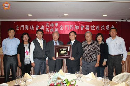 金門縣議會議長王再生率同議員楊應雄、許玉昭、王碧珍、歐陽儀雄、林孫全一行,昨抵高雄展開考察、參訪活動,首日與高雄縣市金門同鄉會聯誼座談會「搏感情」,高雄縣市金門同鄉會全體成員感受到王再生的用心及誠意,現場報予熱情掌聲表達感謝心意,雙方並致贈紀念獎牌,充分展現旅台鄉親的團結與向心力。 這也是第五屆金門縣議會首次組團赴南部高雄縣市進行考察、參訪活動。王議長為上回率議員赴台拜會視察,因為時間的關係無法親自至各同鄉會拜會,表達歉意;他指出,這次特別安排時間到南部各同鄉會瞭解、傾聽旅台鄉親們的意見,目的希望大家能夠提供寶貴的經驗與建言,讓金門在短期間內有很好的建設成果。 縣議會由議長王再生擔任團長,與高雄縣市金門同鄉會舉辦聯誼座談會。聯誼座談會由高雄市金門同鄉會理事長翁明祺、高雄縣金門同鄉會前理事長黃康成、高雄市金門同鄉會總幹事翁維麟、高雄縣金門同鄉會總幹事黃國田與同鄉會理監事,他們感謝幾十年來首次有議長率同議員同仁來訪關心。 王議長表示,此行藉由關懷南部地區鄉親之機會,與同鄉會鄉親舉行座談會,同鄉會理監事都是各行業的菁英,希望大家從各領域不同的角度,多給金門建言,並給議會指導,作為議政推動的參考,同時歡迎事業有成的好友前來金門投資。會中鄉親關心金門大橋興建現況,以及金門大學島,將來陸生和台生招生的因應之對策、土地取得作法及窗口平台等相關事宜。 另外,機票太高以至於返鄉成本過高,應比照澎湖離島優惠的七折票價;金酒朝國際化經營,讓金酒永續成為「金雞母」;博弈條款的反對贊成應讓鄉親明瞭得失;會務運作的補助對象應有效篩選,而且能提高服務功效;成立「地雷博物館」或特區,增加軍事觀光的價值與趣味性等種種有關的金門未來發展的建言。 王議長表示,針對金門大橋屬於國土開發,可是金門縣政府卻要出資三分之一,以金酒公司每年上繳中央超過四十億元經費來看,這對金門是相當的不公平。大橋順利興建也會給政府帶來穩定的稅收,可以帶動整體經濟發展,但後續的配套作業也應做好,鼓勵外資進行投資大飯店等觀光產業,才能創造商機與發展。 王議長也跟同鄉會透露,「金門大橋」工程將於年底先從小金門開工,因為湖下的部分土地徵收,民眾有意見,才會做這樣的考量。此外,他也跟李縣長建議金門大橋上還可以增設景觀拱橋等,增添大橋的可看性。 王議長強調,這小三通的進出人次今年約一百五十萬人次,如果大陸再開放旅客自由行,將來旅館、飯店的投資要加速進行,希望靠大家的力量,讓更多人認識金門、喜愛金門、進而投資金門,促進地區的就業與發展。王議長與金門同鄉會詳盡的說明,雙方有了一次良性而有效的溝通,讓同鄉會暢所欲言對金門施政的建言和看法,感受到議長十足的誠意和親和力。