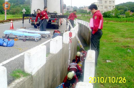 為加強所屬人員災時緊急應變能力,提昇災害搶救技能,烈嶼消防分隊昨日一項低所救助演練,模擬情境假設機車雙載,為閃避來車而不慎摔落大水溝,傷患均意識不清及疑似有頸椎受傷。接獲報案之後,烈嶼消防分隊立即出動消防車、救助車及救護車趕到現場搶救送醫,整個過程詳實逼真,猶如真實救災現場一般。 烈嶼消防分隊低所救助演練昨天上午十時舉行,由縣消防局大隊長陳國瑋及課員董必文到場督核;這次演練係以侷限空間低所救助搶救演練為主要項目,現場模擬機車為閃避來車而不慎摔落二點五公尺深的大水溝,兩名傷患意識不清,疑似有頸椎受傷,生命在危急之中。 首由兩組救護人員先架設雙截梯接近病患,進行基礎生命徵象評估,並予以必要急救措施;另一組救助人員操作救助車,將病患固定於長背板後,吊掛至路面送醫急救,整個演練過程詳實逼真。