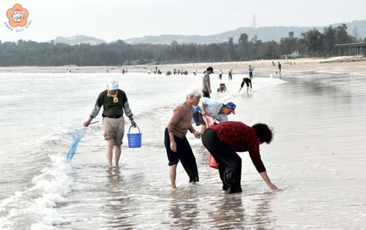 梅姬颱風過境金門,未傳出重大災情;但大浪將海中「颱風螺」颳上海灘,大批民眾昨天聞風,蜂擁到料羅海灘撿拾,形成一條彎彎曲曲的人龍,有人徒手撿拾,經驗老到的用網去撈,無論大人、小孩不顧被海浪打濕,均撿得不亦樂乎,滿載而歸,笑呵呵! 颱風螺的學名為「錐螺」,又叫尖母螺,俗稱九層螺、豬公螺、螺絲螺、鑽仔螺,生長在水深十公尺的淺水區,採拾不易;但是,每每在颱風過境,會被大浪颳上淺灘,因此稱為「颱風螺」。撿拾回家洗淨後,以九層螺(颱風螺)炒九層塔,成為一道美味的下酒菜,老饕說是「燒酒螺」;同一種海螺,擁有不同的名字,十分有趣。 由於颱風螺為高經濟海中生物,一公斤市價約新台幣一百元以上。在梅姬颱風一離開,南海岸的料羅海灘颳進「颱風螺」,在昨天海水剛開始退潮,就有許多聞訊趕到「五鄉八堡」的人,有的拿水桶、有的拿網袋、有的拿塑膠袋,排成一條彎彎曲曲的人龍,在浪花中搶著撿拾「颱風螺」,以及另一美味文蛤,不分老少,人人滿載而歸。 每逢颱風過後,料羅海灘均會出現撿拾颱風螺的人潮景象,也為寧靜的海灘帶來歡樂的氣息。颱風螺的形狀頭大尾尖,一般烹煮是先把尾巴剁掉,再以酒、蒜頭、辣椒、九層塔等大火快炒,螺肉入口彈牙,是餐桌上下酒的美食;也有人將撿拾來的颱風螺,拿到市場去賣,受到老饕的喜愛,也意外賺了一筆颱風財。