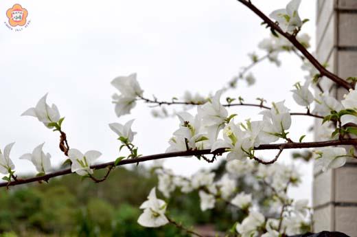 李增汪/圖文 九重葛開白色花,賞心悅目。 屬於紫茉莉科的九重葛,別名三角梅、紙花,是常綠蔓性灌木。葉為心臟形或三角形,全緣、葉對生,葉腋有刺。其花小不顯著(通常無花瓣),聚織花序,花苞特別大而明顯。三合生,似花。 九重葛花色有紫色、紅色、白色、橙黃色或深紅色等。有單瓣、重瓣及斑葉品種。 九重葛適合於庭園、盆栽及陽台栽植;莖具有蔓,舉凡綠籬、花棚、花廊、綠柱、盆栽盆景及綠門等很適用。