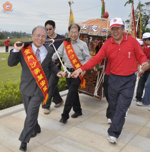 大宋三忠王聖誕,金門沙美萬安堂一連兩天辦理慶典,昨日巡境、鎮五方、吃三牲粿儀式,人數破表、熱鬧非凡。縣長李沃士、議長王再生抬轎祝賀,金城北鎮廟、浦邊蓮法宮以及電音三太子等也前來熱鬧。慶典成功圓滿,三忠王乩示勉信眾,行善、遠惡、惜福增延壽。 金門沙美萬安堂歷史悠久,境主為保生大帝,並祀奉有大宋三忠王、池王爺、李王爺、蘇王爺、林王爺、魁星爺、神農大帝、關聖帝君、廣澤尊王、恩主公、太子元帥、大道公、案頭相公、下壇爺(虎爺)、註生娘娘、土地公等神明;並設有五文昌殿、藥師殿、月老殿,近年來透過道教文化祭及各式慶典,名聲更響亮,也逐漸成為觀光客抵金必訪之廟宇。 萬安堂大宋三忠王乃指文天祥、陸秀夫、張世傑,其孤忠勁節、壯烈捐軀,從容取義之浩然正氣千古垂青,備受後人崇敬及禮祀。史載其生而忠烈、歿為正神,受玉旨敕封代天巡狩威嚴天尊大宋三忠王,沙美境眾在其駐鎮解除瘟疫危疾後,塑像崇祀迄今。而沙美萬安堂三忠王是自大陸同安洪塘鎮三忠廟分爐;今年慶典前信眾也浩浩浩蕩蕩至祖廟進香,包括議長王再生、議員楊應雄、王碧珍等也隨行。 沙美萬安堂自農曆九月十六日起舉辦「二○一○第五屆金門傳統道教文化觀光祭暨慶賀萬安堂三忠王聖誕慶典」活動,這是沙美所謂的大熱鬧,也是代表性的慶典之一;不僅各地香客絡繹不絕前往拜拜祈福;更有自台灣來的虔誠信眾,而旅外的金沙鄉親也特別返鄉參與盛會。 沙美熱鬧大代誌,除了議長王再生、議員楊應雄返鄉逗陣熱鬧外,縣長李沃士也特別抽空前往參加,和沙美民眾共同慶賀三忠王聖誕,與王議長小試身手,抬三忠王神輦加入慶典行伍中,為地方祈福。現場鑼鼓聲、鞭炮聲陣陣作響,兩人臉上掛著笑容,並不時互相稱讚!和樂融融。 昨日巡境、鎮五方、吃三牲粿隊伍綿延數里,王爺神輦全出動,主委黃瑞華、長老召集人張敦鴻、副召集人張水恭等率眾拈香隨行,步行近五公里;而家家戶戶也在榮光新村前廣場、沙美車站、大菜宅、忠孝新村籃球場等設案備牲禮拜拜,熱烈慶祝,祈求合境昇平。 巡境隊伍自下午十二時許出發,五時許返回萬安堂,過程順順利利,三忠王乩身也在巡境中不時向民眾及孩童揮舞令旗,信眾高喊「發啦」,象徵消除業障及護祐平安。 慶典熱鬧非凡,隊伍所到之處吸引大批民眾圍觀,人數更勝往年。大宋三忠王張府王爺、文信國公分別乩示「行善歡喜行、除惡勤懇除、惜福增延壽、陰騭遺子孫」、「近善遠惡杜災殃」和信眾共勉。 一年一度的三忠王聖誕慶典活動,可說是大熱鬧,讓沙美昨日超人氣;昨晚男男女女聚集廟前廣場,依生肖過布橋,祈求平安,典禮也在慶賀聲中劃下圓滿句點。
