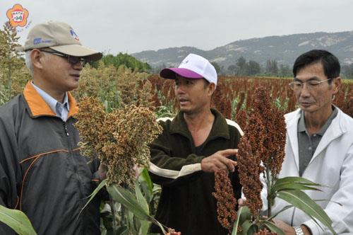 「好高粱、釀好酒」!金沙農友黃尚白配合試種新品種「金選21號」、「金選90號」,成熟期遇上「梅姬」攪局,農民天天準備搶收;農試所代所長陳佳結、金酒公司副總經理張國原率隊到場關心;對於現場所見兩項高產糯性品種之產能深具信心,盼能取代現有品種,再創農產及金酒品質之雙贏。 為提昇地區種植高粱的品質與產量,達成「好高粱,釀好酒」的理想,金酒公司與農試所自九十七年起,引進各類特殊糯性高粱新品種,推廣給農友試種植,三年來已完成六種品種之試種;今年度首次引進「金選21號」、「金選90號」推廣試種。 金沙后水頭農友黃尚白,配合在原本種植高粱之農地上,試種「金選21號」、「金選90號」兩品糯系高粱各一公頃,目前正值成熟期,高粱穗結實纍纍、紅通通的相當醒目,和一旁的「台中5號」,一紅一白形成強烈對比。 不過,高粱成熟時遇上「梅姬」颱風,擔心首次試驗品種受波及,影響後續試釀及推廣,農試所代所長陳佳結、金酒公司副總經理張國原,日前聯袂趕到現場探勘,希望助農友做好颱風前預防工作。 農試所指出,「金選21號」株高約一百七十公分,在春、秋之栽培日分別為一百一十五天及一百天;各季產量每公項至少可達四千公斤以上。「金選90號」株高約一百三十公分、栽培日約一○三天,產量約四千公斤左右。兩種品系高粱子實顏色均為紅色,都是高產量抗風、抗倒伏性之品種。 首次在金門試種,農友黃尚白向所有人介紹種植經過以及目前成長之差異性。其中,兩新品種已成熟可採收,又以「金選90號」為最快,兩者高度均較「台中5號」來得高、結穗情況優,相信以現場之生長情形,產質會較不錯;聽聞颱風來襲,時時刻刻準備搶收,以將損失減至最低。 農試所代所長陳佳結指出,今年首次推廣種植的「金選21號」和「金選90號」,栽培面積各一公頃,採收後將交由金酒公司試釀。至於實際栽培成果如何,收成後就有明確答案;而經試驗若能有助提高金酒品質,後續將會擴大推廣種植,敬請農友拭目以待。 金酒公司副總經理張國原則表示,「金選21號」和「金選90號」為高產糯性高粱;「台中5號」則屬梗性。從歷年公司研究顯示,糯性高粱其因作物本身成份和特性,比梗性更適合釀酒;未來將透過科學理性試驗、感官品評呈現試釀結果,若各項分析均優於現有之品質,除深具推廣價值,亦能夠再創高粱產值及金酒品質之雙贏。 颱風走了,高粱更紅了,黃尚白說,颱風前搶收十分地,暫放置農試所,今年第一次試種兩品系,若以現場目測生長情況收成成果佳,但擔心的是穩定性;也願意配合再試種;未來若收益好、釀好酒、穩定性高,農試所大量推廣種植,農民何樂而不為。 農試所指出,按近年平均統計,已推廣十餘年的台中5號,平均每公頃產量約三千至三千五百公斤;而目前預估兩頃新品系每公項之產量應可達四千至四千五百公斤,實際數字需待收成後才能揭曉。