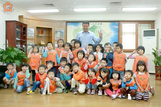 金湖幼稚園九十四位師生到金湖鎮公所作客,鎮長蔡西湖熱情接待,引導師生參觀並透過觀光影片播放,讓小小貴賓更進一步認識金湖的美以及公所服務內容。最後更準備禮物相贈留念,讓幼生好不開心。金湖幼稚園園長黃莉莉表示,這是配合課程的延伸教學活動,期藉此增廣幼生視野並協助其培養社會能力,更加貼近自己的生活環境。 配合美麗的金湖課程主題,金湖國小幼稚園大班八十七位幼生規劃延伸教學活動,在園長黃莉莉等七位師長帶領下,上午九時起到金湖鎮公所作客,透過實際參觀,解決師生在課堂中討論的疑惑。小朋友童言童語,為昨日的金湖鎮公所注入許多歡笑聲。 金湖國小八十七位幼生加上七位師長,一行九十四人昨日到訪金湖鎮公所,受到鎮長蔡西湖的歡迎,他帶領師生踏遍每一樓層,介紹各課室服務內容,各會議空間之用途,並播放二○一○花蛤季觀光影片,增進師生對金湖的認識。幼生看到片頭就開喊「花蛤季」,讓鎮公所十分欣喜也知道原來小朋友對花蛤季情有獨鍾,拿出準備好的花蛤季特製胸針以及禮品相贈,學童滿意表情全寫在臉上。 蔡西湖昨也充當老師和小朋友在三樓會議室問與答,他歡迎小朋友長大後到公所服務,學童不假思索就回答好,令一旁師長笑開懷;小小貴賓到訪金湖鎮公所,為平日嚴肅的辦公室增添許多笑料。雙方在歡樂的氣氛中互相道別,結束參觀行程。 金湖國小幼稚園園長黃莉莉說,活動除了是課程主題的延伸學習外,希望藉此讓幼生增廣見聞、和自我居住的環境產生有意義的互動,並能培養社會能力,探索及珍惜金湖鎮的美麗。