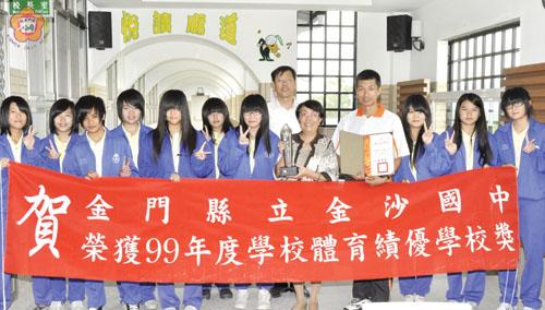 金沙國中文武雙全!今年度代表金門縣,從八十個團體中脫穎而出,教育部九十九年度體育績優學校獎殊榮。校長何莉莉表示,一般認為會念書的孩子不會運動,實則不然;沙中學生允文允武;獲獎榮耀屬於學校每一份子,也鼓勵學生多運動、少電動。 教育部為表揚致力推展學校體育有具體績效之團體與個人,自民國九十二年起,每年辦理獎勵學校績優團體及個人之評選,九十九年度表揚項目包括績優學校、績優機關、績優團體等三項;個人獎項計有教學傑出、活動奉獻、運動教練、終身成就等四項;教育部從各縣市推薦之八十件團體及個人,遴選專家學者評選出三十七個績優團體及個人獎。金沙國中榮獲國中組績優學校獎;另外,開瑄國小王珮如老師則獲得活動奉獻獎之個人獎項。 金沙國中全校十一個班級,兩百九十一位學生,加上四十位教職員工,全校師生共計三百卅一人。學校擁有良好的運動環境,體育教學正常及多元化,並且在行政充分配合體育運動推展下,師生享受運動的樂趣,也讓學生近年在地區大大小小賽事中屢獲佳績。 金沙國中各運動代表隊,參與地區及全國性賽事成績表現亮眼,包括,榮獲教育部九十九年度全國各級學校拔河比賽榮獲國女乙組第一名。九十九年金門縣中小學拔河錦標賽榮獲國女組第一名、國男組第二名。九十九年縣長盃桌球賽榮獲國男組第二名。九十九年金城盃羽球錦標賽榮獲國男組第一名。九十八年金門縣中小學田徑錦標賽國女組田徑總錦標第一名、國男組田徑總錦標第二名。九十八年全國國中班際大隊接力比賽金門複賽榮獲八年級組第二名。九十八年第三屆美珍香盃桌球錦標賽榮獲國男組團體第二名。九十八年金門縣春季越野國女組團體第一名。