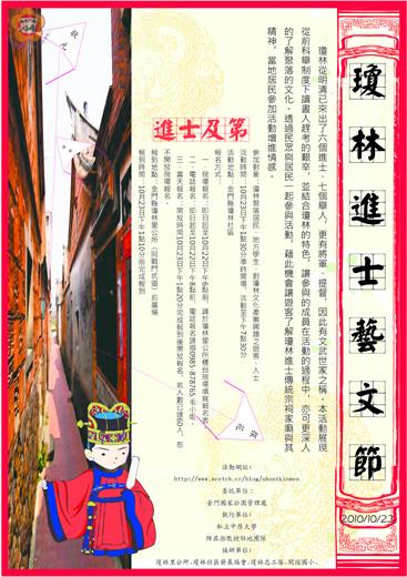 「2010瓊林進士藝文節」即將在本周六(十月二十三日)下午於瓊林舉辦;歡迎地方人士、學生或遊客報名參加,名額為六十人。 根據承辦單位中原大學駐金團隊的說明,「2010瓊林進士藝文節」的報名方式如下: 十月二十二日下午六時前於瓊林里公所現場填寫報名表。二、十月二十二日下午八時以前,用電話報名-撥0985-878765洽毛小姐。三、現場報名:於十月二十三日下午一時三十分在瓊林戰鬥坑道前廣場現場,但若人數已滿,則不接受現場報名。 「2010瓊林進士藝文節」將於十月二十三日下午一時三十分在瓊林怡穀堂前開幕,活動的目的是希望參與者從闖關過程中,體認科舉制度下,讀書人進京趕考的艱辛,並結合瓊林的特色,體驗聚落文化。開瑄國小的社區技藝學苑成果發表會也會在瓊林進行。活動詳情可上網查詢;網址為http://www.wretch.cc/blog/aboutkinmen。 「2010瓊林進士藝文節」是由金門國家公園管理處委託辦理,由中原大學陳其澎教授駐地團隊承辦。活動內容包含常民信仰解說、「尋遍家院、暗中尋覓難關體驗」、「科舉考試」及「墨繪飛揚」創意作品等。陳其澎教授還將為大家解說瓊林心靈防衛系統厭勝物與瓊林傳統閩式建築之美。