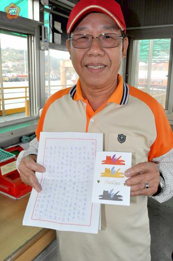 一位僅到烈嶼上班四天的楊姓女騎士,在搭乘大小金門交通船上下船時,一個不小心摔個人車朝天,在浯江輪渡船員幫助下脫困,不過仍驚魂未定,不敢再騎機車上下班;這位楊姓女騎士寫了一封充滿溫馨和感情的感謝函,向浯江輪渡船員大哥們道謝,讓船員備感溫馨。 楊姓女騎士在寫給浯江輪渡船員大哥們的感謝函中表示:「星期一晚間,由於小妹的機車與前方太靠近,當前方突然停下時,又處於斜坡地段,一個不小心、反應不及,就跟著車滑下去,完全慌掉,體重也比不上車的重量,最後的結果,就是摔倒,對我來說,從未發生這樣的事。」 她說:「當下只有全身痛和頭很暈,講不出話來;卻知道有很多人在幫我的忙,還有位大哥幫忙將車牽上去,沒想到會這麼巧,讓縣長看到,整個不知要說啥才好,完全都在意料之外。」 楊姓女騎士:「這也是我將車子運去小金上班的第四天,已和公司聯絡,目前不會再運過去;這場小意外,仍造成自己有些不便。但,最重要的是掛念著幫我的船員;在此,以這封簡短的信,表達對你們的敬意,感謝大哥們!」 船員們接獲楊姓女騎士的感謝函,感到十分欣慰;未來將盡本份為來往於大小金旅客服務,也希望旅客能配合上下船的規定,讓航駛於大小金海域的輪渡更安全,讓所有的旅客平安的抵達目的地。