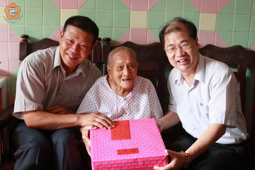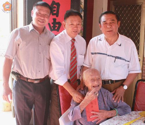 九九重陽敬老尊賢,縣長李沃士昨日上午到金湖鎮探視十位百歲人瑞,轉發內政部金鎖片、佳節慰問金以及縣府的賀禮;並贈送禮品給八十五位九十歲至九十九歲高齡長者;李縣長與長者話家常,彼此歡歡喜喜笑聲不斷。 金湖鎮今年共計有十位逾百歲人瑞,分別是,蔡滄海、楊黃瑞愛、吳有章、楊清雲、吳黃配、陳水治、謝陳治、陳呂仙、陳李牽、呂陳伊等,另外有八十五位九十歲至九十九歲高齡長者,縣長李沃士昨日上午在金湖鎮鎮長蔡西湖的陪同下,送愛到長者家中,也祝賀長者生活更快樂。 其中,家住金湖鎮湖前的陳呂仙,民國前四年出生,年逾百歲但耳聰目明,六代同堂的她和縣長話家常,聲音十分宏亮,身體好精神佳,讓一行人感受到長者的活力與朝氣,紛紛向她道賀,祝福天天健康。 另外,縣長也贈送賀禮給蔡朝栽等高齡長者,現年九十二歲的他,天天在瓊林老人會忙進忙出,和老朋友泡茶聊天、打打四色牌、玩國粹等,生活十分快樂,縣長也祝賀他佳節快樂、長命百歲。 記者陳麗妤/金沙報導 縣府、金沙鎮公所昨聯袂轉贈金鎖片及賀禮給金沙鎮五位逾百歲人瑞,祝賀佳節快樂。 向百歲人瑞賀佳節,社會局局長方天吉、金沙鎮公所秘書張峰杞、課長陳淮任,昨日下午聯袂到百歲人瑞家中,轉贈內政部金鎖片、總統馬英九佳節慰問金以及縣長李沃士的佳節賀禮,表達社會的關懷和祝福。 金沙鎮共計有五位逾百歲人瑞,分別是三山里梁蔡春,民國前三年出生;三山里楊掽,民國前三年出生;西園里黃網治,民國前五年出生。浦山里許陳錦治,民國前三年出生;浦山里王仁樸,民國前四年出生;昨日分別收到中央及地方的祝福,讓百歲人瑞倍感窩心,家人也感到無比榮耀。