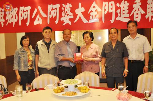 歡慶99年重陽節!烈嶼鄉昨天舉辦阿公阿婆赴大金旅遊活動,來自各村一百四十餘位老人家,在鄉公所貼心安排,前往金湖鎮的護國寺禮佛和順濟宮參拜海上守護神媽祖祈福之外,也參觀擎天廳等地;中午,金門縣議會設宴款待和歡迎,與會縣議員祝福阿公阿婆身體健康,重陽佳節快樂! 繼縣府舉辦重陽敬老觀光景點參訪活動後,烈嶼鄉昨天也舉辦阿公阿婆赴大金旅遊活動,受到各村年滿六十五歲以上老人家的喜愛,相招報名逗陣參加,結伴到大金遊玩;同時,鄉公所也藉以宏揚敬老美德,鼓勵老人家多多走出戶外,增進休閒生活娛樂和身心健康,也提前歡度九九重陽佳節。 參加大金旅遊活動的烈嶼鄉阿公阿婆一行,昨天上午八時,在鄉公所社會課人員和志工的陪同下,搭乘大小金交通船到大金;大家能結伴同船出外進香和參訪,均顯得很開心和愉快,並以風景名勝、古蹟、廟宇為主要參訪地方。 中午,為歡迎烈嶼鄉阿公阿婆到大金進香、旅遊,縣議會假葡京設宴款待遠來的老人家,縣議員林金量、唐麗輝、歐陽儀雄、林孫全,以及議會秘書長許丕贊和各室主管均出席與會和阿公阿婆餐敘。許丕贊也轉達議長王再生交代要熱忱的接待與歡迎,祝福身體安康,佳節愉快。 縣議員、也是前任鄉長林金量為阿公阿婆介紹議會同仁給大家認識,他說,進香到處走走,也是一種運動;而,拜拜時,說的都是內心的好話。所以,烈嶼的老人家健康又長壽,並祝大家九九重陽節快樂! 烈嶼鄉長洪成發除致送小禮物給阿公阿婆,並感謝縣議會熱忱、盛宴的接待,讓烈嶼鄉阿公阿婆感到十分的窩心,提前度過一個溫馨的重陽佳節。最後,烈嶼鄉阿公阿婆來到水頭參訪,搭乘昨天下午二時三十分班船返回烈嶼,結束愉快的大金旅遊之旅。