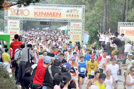 2010四季馬拉松-秋季金門環島馬拉松賽,昨日由內政部營建署副署長許文龍、金門縣長李沃士等來賓鳴槍起跑,包括全馬、半馬和全民健跑組近兩千名男女選手參賽。許文龍表示,營建署舉辦四季馬拉松活動,來慶祝建國百年,也宣導國家公園保育理念。李沃士也推銷金門的環境很適合休閒旅遊,他歡迎有更多世界各地的好朋友來金門領略美麗的景色,品嚐戰地特產高粱酒,為人生留下美好的回憶。 昨日清晨六時不到,來自各地參與馬拉松賽事的選手和金門民眾、學生陸續湧進金門國家公園中山林遊客中心,讓中山林「人氣十足」。營建署副署長許文龍、金門縣長李沃士、金門防衛部指揮官張慶翔、中華民國路跑協會理事長曹爾忠、台北市體育處科長袁守方、金門國家公園管理處長曾偉宏、太魯閣國家公園管理處副處長張登文、金寧鄉長陳成勇、金城鎮長石兆日、金沙鎮長陳昆第等來賓也起個大早,一起參與活動。 金門縣長李沃士特別感謝營建署選擇在金門秋高氣爽的好氣候,辦理環島馬拉松賽,也幫金門做觀光推銷,他代表金門鄉親,以熱情的心情,歡迎各地的金門好朋友以及選手,也祝福選手們突破自己的成績,為個人再添新紀錄。 李縣長也感謝主辦和協辦單位為活動所付出的努力,讓活動圓滿又成功。他說,金門擁有美麗的自然環境和豐富的多元文化,很適合休閒旅遊,也是舉辦路跑活動的好所在,他希望所有參與活動的好朋友,沿著環島馬拉松路線,飽覽金門美麗的風光景色,還要品嚐金門戰地獨有的特產高粱酒,從活動中感受金門人濃濃的人情味,為這一趟金門之旅,留下人生非常棒的記憶和回憶。 營建署副署長許文龍指出,營建署呼應行政院擴大辦理建國百年相關慶祝活動,選定四處深具獨特自然生態景觀及人文資源特色之國家公園,舉辦四季馬拉松活動,春季墾丁、夏季陽明山、秋季金門、冬季太魯閣,並於今年「台灣99」啟動,讓慶祝建國百年慶,更具意義性。他說,金門是第三站,祝福所有參與活動的選手和民眾,跑出好的健康,好的未來。 中華民國路跑協會理事長曹爾忠指出,該會一年中辦了十多次場的馬拉松活動,獲得國內外愛好慢跑運動人士的熱烈迴響,國內慢跑運動的風氣也一年比一年好,有效提升我國田徑運動風氣。他說,金門國際馬拉松賽,參與人數也愈來愈多,愈辦愈好,有豐碩的成果,他祝福大家跑出健康、快樂和希望。 許文龍、李沃士等來賓也為活動鳴槍開跑,選手展開全程馬拉松組、半程馬拉松組的競賽,還有全民健跑組的共襄盛舉。 (相關新聞見二、四版)