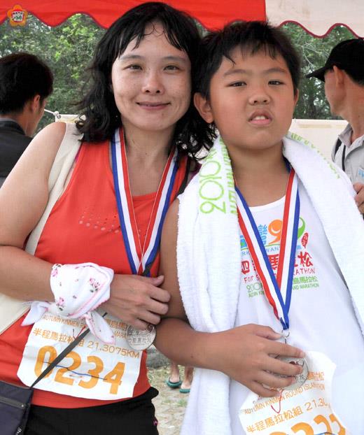 張建騰/圖文 愛上金門! 李婷英(左)、柯亮宇(右)母子去年聖誕節曾到金門騎腳踏車,從此喜歡上金門;他們抓住機會,參加秋季金門馬拉松,再度踏上金門島。 柯亮宇是半程馬拉松賽中,年紀最小的選手,今年只有十一歲,還在唸小五。他覺得金門很美,這次的活動讓他很感動;他說要多加練習,將來繼續參賽。