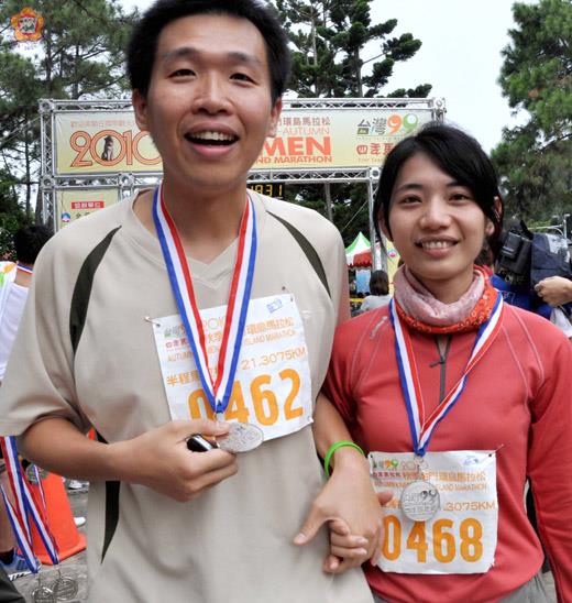 張建騰/圖文 相偕跑半馬,同心登百岳! 鄭克勇(左)和余文君(右)是情侶檔;他們牽手跑向半馬的終點,希望對感情的堅持也能長長久久。 跑完金門半馬,他們還想去登台灣百岳。