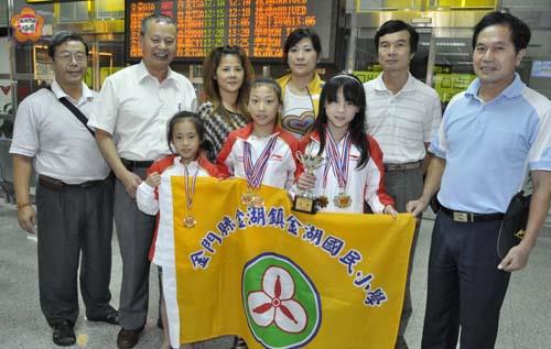 金湖國小女子體操隊「金」厲害!楊鈺婷、葉品嶸、黃慧玫、黃子星,在九十九年全國競技體操錦標賽拿下七項冠軍(含成隊第一),帶回九面金牌為大會之最。選手昨返金師生列隊歡迎,讓小妮子十分害羞。教練梁萍表示,選手表現可圈可點,目標放眼全國運動會和後續升級(國中組)訓練,並且有計劃性地,配合體操館工程將有計劃地向下培訓新血。 金湖國小女子體操隊,十月二日於宜蘭縣立體操館(宜蘭縣羅東國中內)參加九十九年全國競技體操錦標賽,從全國三百位選手中脫穎而出,拿下高年級組成隊第一等七項冠軍,抱走九面金牌,消息傳來全校師生歡欣鼓舞,選手昨返金回到學校上課,師生夾道歡迎道賀。 金湖國小女子體操隊,今年報名高年級組團體賽及個人單項,成員包括楊鈺婷(六年級)、葉品嶸(六年級)、黃慧玫(四年級)。另外,幼大班黃子星參加低年級平衡木單項。其中,低年級組共計有九隊二十二人;高年級組共計有十隊三十三人,四位選手技高一籌,包辦七項冠軍,九面金牌、五面銀牌、一個第七名,成績十分亮眼。 四位翻滾吧女孩!昨搭機返金,師生大陣仗在校門口列隊歡迎,幼大班學生獻花圈,國小學生拉炮歡呼,向同學道賀。校長翁明國表示,體操館預計年底可以完成,屆時選手的訓練將更完善,不用和其他單項運動搶場地,教練團也能夠再做下一個階段的銜接訓練。 今年拿下五金一銀的楊鈺婷和抱回兩金四銀的葉品嶸說,相較於全國運動會大場面令人緊張害怕,此次反而能夠放手一搏;從幼稚園到六年級每天都面對新的挑戰,每次遇到挫折想放棄時,想起第一次參賽的投入以及領獎時的感動,所有的辛苦全都放諸腦後,一切努力都有代價。 楊鈺婷的媽媽許榮文說,一路走來已戰勝許多考驗,從低年級到中年級到現在,楊鈺婷成長不少,只要她堅持到底,一定百分百支持;樂見她和品嶸繼續努力,再創佳績。 葉品嶸的媽媽盛琪媜則指出,對品嶸而言最害怕運動傷害,大大小小賽事一路走來,每天在練習和課業中奔跑,看來十分辛苦但看到她登上舞台那一刻,一切是那麼地欣慰;只要她願意永遠支持;也鼓勵她和鈺婷攜手向前邁進。 今年四年級的黃慧玫,參賽經驗較少,不過她是全隊最有口福的,此次參與高年級賽事較為吃力,但是她十分開心。她的媽媽鄭雅玲說,練習很辛苦,但是慧玫很有興趣,所以一定全力支持。 黃子星是該賽事全國最幼齒的金牌得主,她首次亮相即拿下國小低年級女子組平衡木第一名,表現十分搶眼。 關於選手今年的表現,教練梁萍說,全國競技體操錦標賽為同齡賽事,對選手而言已不是問題;目標在全國運動會。接下來兩位六年級選手將面臨升級問題,國中組難度更高、比賽更多,年底體操館落成後,銜接訓練才能執行;另外,受限於目前場地空間,待體操館完成後,將有計劃地向下培訓新血。 金湖國小女子體操隊在九十九年全國競技體操錦標賽拿下九面金牌(含成隊冠軍),成績如后:國小高年級女子組:成隊第一名:金湖國小。個人全能:第一名金湖國小楊鈺婷、第二名金湖國小葉品嶸、第七名金湖國小黃慧玫。跳馬:第一名金湖國小楊鈺婷、第二名金湖國小葉品嶸。高低槓:第一名金湖國小楊鈺婷、第二名金湖國小葉品嶸。平衡木:第一名金湖國小葉品嶸、第二名金湖國小楊鈺婷。地板:第一名金湖國小楊鈺婷、第二名金湖國小葉品嶸。國小低年級女子組:平衡木:第一名金湖國小黃子星。