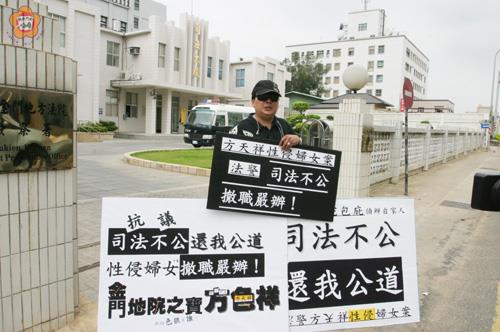 金門林姓珠寶商不滿妻子遭金門地院前方姓法警長性侵案,業經金門地檢署檢察官具體求刑12年在案,金門地院法官卻輕判被告為3年6個月及未撤職查辦乙案,他昨在法院前拿大字報抗議司法不公,涉嫌包庇自家人,同時向監察委員提出陳情,要求司法還給他全家一個公道。 林姓珠寶商對愛妻遭性侵案,近三年來抗議司法處理不公可以說是鍥而不捨,昨再度出現在司法大廈門口拿大字報抗議,引起路人側目;金門地院表示,全案由法官依法審理判決,院方並對涉案者先做行政處分,沒有所謂的包庇情事,現在已經進入二審程序,不便就案情發表意見。 林姓男子於法院拿大字報抗議後,續又於上午到金門縣政府向抵金巡察受理民眾陳情的監察委員沈美真陳情司法不公,要求將被告撤職查辦。沈美真受理案件後表示,全案在司法審理中,只能就程序是否有瑕疵進行詳查;沈美真並建議陳情人向司法院公務員懲戒委員會提出陳情。 林姓男子哽咽地指出,他實在是訴苦無門,飽受殘害,很想不開,常想走上絕路,但又心有不甘,又顧及到妻兒及年老母親扶養與照顧責任,內心是百般痛苦煎熬。對被告擔任法警長卻知法犯法,其太太在福建更生保護會工作,小舅子為地院書記官,讓人質疑法院「官官相護」,行政處理不公。 林姓男子並表示,被告在一審判處有罪後,只被停職處分,每月竟然還可領取新台幣1萬5千元薪水;他質疑是否因被告是前法警長身分,所以法官才給他特殊待遇?他大聲疾呼,地院應給予撤職查辦,更期盼福建高等法院金門分院伸張正義,秉公儘速審理。 金門地院表示,方姓前法警長,在97年9月即因涉及性侵案,經調查後行政處分記過2次,改調為非主管的法警,一審判決有罪後,報請司法院移送公務員懲戒委員會處理,司法院並附帶做停職處分,在調查中給予統一薪俸半薪,一切秉公處理,並無所謂的包庇情事。 林姓男子說,其妻子遭到方姓前法警長性侵,被金門地檢署提起公訴具體求刑12年,地院今年5月間判處妨害性自主、恐嚇等罪,應執行有期徒刑3年6月,他認為,司法應將被告繩之以法並給予重刑處分,以給受害家屬一個公正審判交代。他已提起上訴。
