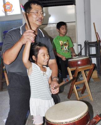 「咚-咚-鼕-鼕-,咚咚鼕鼕打打打-!咚-咚-鼕-鼕-打打打打-咚鼕-!」漸強、漸弱、時大、時小、時沈、時猛的鼓聲,在開瑄國小校園中「撲冬冬」、「普鼕鼕」地擊、叩、搥、擂,小朋友們正在學習新的鼓曲-「雷霆萬鈞」! 開瑄國小的大鼓隊是從「二十四節令鼓」發萌,他們的鼓聲已經響遍金門。約每半年一次,教練林玉龍就會到開瑄國小指導鼓隊;昨天和前天,他教給小朋友們的鼓曲是「雷霆萬鈞」。 林玉龍把「雷霆萬鈞」分為四十二段,每一段約為「四四拍子」的四到八小節;他用簡單的符號讓小朋友們可以容易上手,例如以空心三角表示打邊,以實心三角表示兩手打邊,以空心圓圈表示打鼓,以實心圓圈表示兩手打鼓;以阿拉伯數字的一、三、五、七表示右手,以阿拉伯數字的二、四、六、八表示左手。林玉龍表示,小朋友的記憶力像海綿一樣,不用一天半就可以學起來。 今年從台北縣八里國小輔導主任退休的林玉龍是台北縣教師鼓樂團等鼓團的總教練,曾多次率團在海內外演出;台澎金馬,到處都有他教鼓的身影。開瑄國小的鼓隊成立於民國九十三年,林玉龍到開瑄指導鼓藝,已有七、八年的時間,不斷為開瑄鼓隊充電。 林玉龍表示,打鼓是一種生活教育,小朋友可以從習鼓中學到禮節和紀律。鼓打得好不好還在其次,最重要的要讓小朋友學習專注,學習冷靜,學習合作! 他表示,學鼓,有人學得快,有人學得慢;但是能學得快的卻不見得學好,倒是能學得久的就一定能學好。他覺得對弱勢或餒怯的學生而言,藉由學鼓可以增加自信。 在教鼓之前,林玉龍會領著小朋友熱身,包括活動肩關節、高舉手加墊腳尖、拉指、拍手、扭腰、按摩丹田、拍打腿部……;此外,他還指導小朋友練呼吸,由丹田發聲,與頂門共鳴,口中喊出「ㄏㄧˋ」、「ㄏㄨˋ」、「ㄏㄚˋ」、「ㄏㄛˋ」。 在「雷霆萬鈞」中出現的動作有「摘星」、「黃飛鴻」式的平舉等等;林玉龍表示,「雷霆萬鈞」要能打出氣勢和士氣;鼓法不算很難,但隊形變化較多。 昨天早上九點,在開瑄國小的禮堂中,小朋友們還沒有上課,就已經蒸出一臉的汗水;不過,在林玉龍的調教下,小朋友們興趣盎然。他會誇大一些錯誤動作做為對比,也會應小朋友的要求,編一些「火豬陣」(火牛陣改編)、「一串香腸射十二鵰」(一箭雙鵰改編版)的笑話。不過,笑話常常要下回分解,要小朋友學好一段之後,才會編出下文。 綜合鼓隊中蔡卓頻、陳瑋姈、蔡語儂、蔡孟臻、蔡士雍等學生的描述,他們覺得學鼓很好玩,教練很有趣;不過,有時候還是會有人因為沒有練好,掉下了眼淚,讓「穀雨」(二十四節氣之一)變成了「鼓雨」。有人說自己打鼓的動作被同學形容成「童乩」,自己也覺得好笑。有人說自己總是不小心多了一搥,「多此一舉」的結果就成了「害群之馬」,反過來,則是讓大家「重振旗鼓」,多一次練習的機會。 開瑄大鼓的指導老師洪慧真表示,開瑄鼓隊已學過「二十四節令鼓」的表演版和可愛版、「驚蟄」、「寒露」;每次林玉龍來教鼓,他們會在小朋友學會全套後,全程錄影,記下細節,以供反覆練習;否則,小朋友學得快也忘得快。 洪慧真是開瑄鼓隊幕後的靈魂人物之一;她為了重新整理人生,已離校進修中;鼓隊的團務,不久將移交出去;她認為鼓隊如果要成為開瑄的特色,學校的每一份子都應該是參與者。 開瑄國小校長李錫南表示,藉由「雷霆萬鈞」的教習,希望訓練骨幹;接下來,配合學校雙語教學的實施,希望把鼓隊等課後藝文活動,移到週六,把課後校園推展成廈門「少年宮」模式的技藝研習場所。