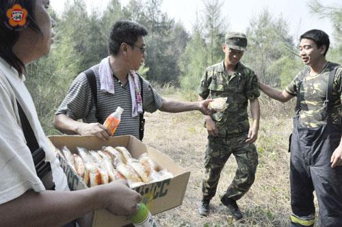 陳麗妤/圖文 金沙鎮田埔水庫周邊林地森林火警昨再度悶燒,警義消自上午九時十七分接獲通報後,陸續趕到場救火,不敢馬虎,有些人甚至為了救火一整天還沒回家,精神令人感佩。 現場火勢隨風勢以及堆積深厚的木麻黃,不斷四處竄燒,軍方聯勤金支部也在上午十一時投入搶救行列,警義消及國軍弟兄全場待命,此時,未能趕到場救災的義消人員,將飲料、水和麵包,送到前線供打火弟兄充飢,軍民救災不分你我!