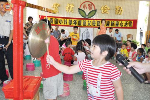 全縣各國中、小昨天開學,也是小一新生的第一個上學日,賢庵國小為迎接新生,昨日舉辦「九十九年祖父母節暨迎新迎心活動」,校長董國正帶領新生穿越「勤學門」(拱門上綁蔥、芹菜,象徵『跨越勤學門,啟動智慧心』),用力敲響大鑼說出自己心中願望,並發給每位新生「聰明祝福包」,整個迎新活動,賢庵國小師生期許學生未來的求學生活能夠「啟動聰明心,快樂勤學門」! 8月29日的祖父母節,賢庵國小為響應教育部「大手牽小手,代代攜手學習趣」之政策,於開學第一天辦理「祖孫互動傳真情、代代同樂學習趣」的活動,鼓勵由祖父母陪同新生蒞校參加開學日,讓所有一年級新生就在祖父母的陪同協助下,來到賢庵這個大家庭,開啟了智慧學習與勇敢自主的另一學習的新篇章,祖父母的協同攙助,更象徵生命傳承的寶貴意義,最終完成這一天賢庵眾師生的滿滿祝福與和樂期盼。 賢庵國小從早上七點二十分開始,進入校門映入眼簾,是溫馨活潑的歡迎情境布置,接著新生在家長的攜手協助下,校長董國正帶領新生穿越掛滿蔥、芹菜的「聰勤門」,希望他們聰明又勤學,最後奮力敲響大鑼,說出自己心中願望,小朋友希望長大後做警察、空姐、護士、考試一百分、軍官等等。金城鎮長石兆瑉、鎮代表會主席陳天成、賢庵里長盧志嶢、吳厝社區理事長吳金水都到場祝福,期望新生在接受教育後在學業及品行上蒸蒸日上。 董國正指出,教育部將今(99)年8月29日(星期日)訂定為第一屆「祖父母節」(未來固定以每年8月的第4個星期日為「祖父母節」)。希望藉由此節日的宣廣,喚起民眾更加重視家庭世代關係,並以「教育」搭起世代橋樑,透過祖父母連結傳統與現代,讓年輕世代認識老化、悅納老人,也讓祖父母在晚年生活與家人更親密,並鼓勵年輕世代更樂於接近長者,分享他們的生命經驗及人生智慧,發揮「老吾老以及人之老」的社會理想,進而達成建構無年齡歧視的社會願景。校方九月三日將邀請家長參加新生家長座談會,了解如何協助孩子適應新生活,並設計多項主題體驗關卡,讓新生在校能有如在家的溫馨感覺,快樂學習、健康成長。
