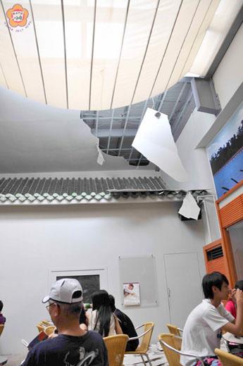 張建騰/圖文 天花板開花,破綻破得巧! 八二三戰史館一處天花板在八二三戰役五十二週年前夕突然破了個大洞。 遊客們昨天(八月二十三日)見狀,許多人都覺得很巧-似乎有八二三砲戰的感覺。館方昨天已請廠商前往勘察,準備進行修護。