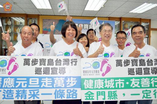 由飛躍羚羊紀政領軍的「迎接建國一百年,萬步寶島台灣行」全國巡迴宣導團,昨日上午開抵金門縣宣導,紀政並推廣日行萬步八年來的深刻感觸與體悟,同時傳達「健康樂活」概念,撒播希望樂活種子。縣長李沃士並以非常高興心情歡迎宣導團蒞金,同時表達全力配合和協助推動宣導團倡議的「元旦健走」、「友善行人」、「精采一條路」計畫構想。 紀政領軍的「迎接建國一百年,萬步寶島台灣行」全國巡迴宣導團,是於昨日上午跨海到金門宣導。縣長李沃士並簽名響應,宣示建國百年元旦健走,金門同步行。 由財團法人希望基金會董事長紀政率領的宣導團,昨日上午十時三十分前進金門縣政府,受到縣長李沃士率領教育局長李再杭、金門縣立體育場場長許換生等歡迎,並在宣導旗幟上簽名響應「萬步寶島台灣行」活動。 紀政指出,七月七日起跑的「迎接建國一百年,萬步寶島台灣行」巡迴各縣市宣導,已經走過二十三個縣市,均獲得支持,金門縣為第二十四站。 紀政表示,希望基金會主辦的萬步寶島台灣行活動,規劃明年元旦在全國各縣市舉行,以推廣八年來日行萬步的經驗,提出「元旦健走」、「友善行人」、「精采一條路」三項倡議,希望營造健康樂活、禮讓友善、人文精采的台灣。 縣長李沃士也表示,金門是適合運動、休閒的島嶼,縣府每年舉辦馬拉松賽、海上長泳、自由車等活動,也致力打造低碳家園。慶祝建國百年的健走活動,肯定會全力支持,讓鄉親更加快樂、健康。 紀政三度為公益活動全國走透透,第一次是2002年代言衛生署「每日一萬步,健康有保固」全國倡導活動,第二次是2007年宣導「十一月十一日全民健走日」及「日行萬步的七個喜悅」,這次為迎接建國一百年,更為第二個一百年撒播希望樂活種子,而再次巡迴全國。 紀政指出,迎接國家一百歲,台灣要以「元旦健走」打造健康樂活台灣、「友善行人」形塑禮讓友善台灣、「精采一條路」發揚人文精彩台灣。這次活動的發想是來自於去年「全國精采一條路」活動的延續。每個人都需要健康,一起運動,讓台灣體育島的概念永續發展。 「萬步寶島台灣行」活動,則有「元旦健走」、「友善行人」、「精采一條路」三大訴求。其中,「元旦健走」,主要是希望促成全國民眾都能參加2011年「元旦健走活動」;「精采一條路」,則盼在2012年各縣市都能有紀錄各自縣內風光道路的圖文集;「友善行人」,期待在2013年台灣行人的行路權能被國際認可。
