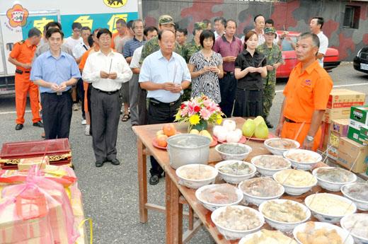 金門縣公共車船管理處慶讚中元節祭典,昨下午六時假九宮碼頭隆重舉辦,烈嶼鄉鄉長洪成發主祭,軍政首長、民意代表及浯江輪渡員工陪與祭,祈求大小金門海域風平浪靜,來往船舶一帆風順、平安。 慶讚中元,場面莊嚴隆重,與祭的有車船處長許一傑、港務處長吳世榮、烈指部指揮官張景陽、縣議員洪麗萍、烈嶼鄉代會主席洪若珊,以及鄉代會副主席蔡金爵和代表林長耕等人。 慶讚中元節祭典中,洪成發依古禮行上香、獻花、獻爵、獻饌、獻果:::獻金鉑後,他率全體陪與祭人員行鞠躬禮,祈求「老大公」和好兄弟保佑大小金門海域風平浪靜,來往海上船舶一帆風順、平安。 記者張建騰 /金湖報導 昨天是農曆七月十五中元節,金湖鎮的大街小巷、大家小戶,所有奉持民間信仰,都有拜門口的儀式;以香火、錢米、面盆水與各式供品招待「老大公」、「好兄弟」;藉施善心,祈保平安。 民間信仰中的「普渡」與佛教的「盂蘭盆會」,都有幫助孤魂滯魄「脫離苦海」或是「解倒懸」的善意;兩種法會在民間信仰中已然混同。 金門地區的普渡各地不一,但七月十五各地都有拜門口的習俗;因為人們謹守敬鬼神而遠之的心理,雖然虔心祭拜,卻只在大馬路或者大門外祭拜,以免「陽宅」內招來「陰氣」。 拜門口的供品,通常是「有什麼拜什麼」,所有供品都會插上一柱香;其中,臉盆裝水上覆毛巾(面盆水)乃是必備之物;武德新莊一位婦女表示,拜後的「面盆水」用來洗臉,有清潔的用意,避免生「粒仔」(即「癤子」;一種小瘡)。