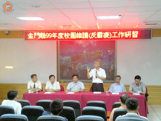 「把溫暖給予最需要溫暖的孩子;把幫助給予最需要幫助的學生。」金門縣99年度校園安全維護(反霸凌)工作研習,昨假金門高中登場,邀請國立草屯商工校長蔡慧登等專家學者專題講座,期落實防制學生暴力霸凌及共同維護校園安全,營造友善校園。 這項研習由金門高中校長蔡錦杉主持,會中邀請國立草屯商工校長蔡慧登、縣警局少年隊黃副隊長書星、開瑄國小李校長錫南擔任講座。教育部軍訓處劉科長家楨、縣教育局王督學任益、縣校外會執行秘書徐督導建宇及各高中(職)、國民中學學務主任、輔導主任均參與研習。 教育部軍訓處科長劉家楨嘉勉各級師長平日對於營造友善校園的努力,也期勉參加研習者積極推動校內防制暴力霸凌教育宣導,共同建立祥和友善的學習環境。研習課程包含:學生常見偏差行為類別及預防與處理。霸凌行為定義、態樣與特質。學生霸凌事件處理與輔導作為(個案分享)等等,同時舉行綜合座談。 據草屯商工校長蔡慧登指出,霸凌(bully)是一個長期存在於校園的現象。專指孩子們之間惡意欺負的情形。具蓄意且傷害性的行為,高達五成以上(54.7%)的校園霸凌事件為言語霸凌,如「嘲笑」、「威脅」、「取綽號」、「罵人」等,特定學童被嘲笑的原因則包括「功課不好」、「長相難看」等。針對霸凌學生、受凌學生和一般旁觀者的處理方式,蔡慧登建議,可協助霸凌學生時與專業合作、給予更多的關懷、進行合理明確的規範、態度恩威並濟。在協助受凌學生時,鼓勵他說出心事、增強孩子的果斷力,並與專業合作。協助旁觀者時,培養其同理心,並給予「反霸凌」的明確訊息。三管齊下,克竟全功。 開瑄國小校長李錫南以「從實踐生活人權中經營友善校園│防制校園霸凌與青少年偏差行為之輔導」為題專題講座,他提議,經查報霸凌事件,應了解案例樣態、增長與否、研判地區霸;校外會由各校通報案例,研訂早期預防性指標;研擬預防、輔導、治療、矯,正及追蹤輔導等措施。 縣99年度校園安全維護(反霸凌)工作研習,主要在增進高中(職)校與國民中學學務、輔導人員處理校園事件知能,防制學生偏差行為、暴力、霸凌、涉入不良組織等行為以有效整合資源,共同維護校園安全,達成營造友善校園之目的。