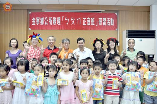 金寧鄉公所辦理暑期母語的「ㄅㄆㄇ正音班」活動已告一段落,鄉長陳成勇於結業儀式中親自驗收小朋友學習本土語言的基礎成果,鼓勵小朋友持續努力的學習,為未來的各階段教育奠下好的根基。陳成勇也帶來「石蚵」鑰匙圈紀念品,拜託家長多多宣傳金寧地方的石蚵產業。 鄉長陳成勇很重視鄉公所利用暑期辦理的母語的「ㄅㄆㄇ正音班」暨「美語夏令營」兩項研習活動,在開訓和結業活動時都親自到場為學子加油打氣,也語多期勉。 隨著暑假假期的接近尾聲,繼「美語夏令營」的結業,「ㄅㄆㄇ正音班」的研習也告一段落,鄉長陳成勇、鄉公所秘書傅仰鑫、課長蔡世舜和家長一起驗受小朋友的學習成果。 陳成勇指出,兩項基礎的母語和外語學習活動,在鄉代會的支持下,鄉公所自編經費辦理活動,豐富了小朋友的暑期生活,有了啟蒙教育的學習基礎。他也感謝前任鄉長李文俊開先例辦活動,幾年下來,已有很好的活動效益,深受家長的肯定。陳成勇也要小朋友有感恩的心,感謝父母、爺爺奶奶頂著炎日接送上、下課很辛苦。他說,有好的學習成果,就是送給家長最好的回報。 陳成勇說,基礎的母語和外語都深深影響孩子未來各教育階段的學習,兩項研習活動只是讓小朋友有接觸的機會,後續的持續學習是非常重要,他希望家長也要多花一點時間,陪著孩子一起學習基礎的語言教育,根基穩固,一定會有事半功倍的學習成果。 陳成勇感謝教師用心的教導,讓小朋友有滿滿的收穫。他也頒發獎勵品肯定學習優異的小朋友,贈送每位小朋友小禮物,並和小朋友相約「明年再見」,小朋友樂開懷。陳成勇很積極推動金寧特色的石蚵產業,他也帶來「石蚵」鑰匙圈紀念品,分送給家長和小朋友,希望他們也加入「推銷員」的行列,多多推銷金寧的「石蚵」,讓更多遊客到金寧鄉觀光旅遊,品嚐營養又可口的石頭蚵,消費市場大,石蚵產業才會有生機。 正音班研習活動,以轄區幼稚班大班的小朋友為對象,一個月的研習課程,寶貝園地教師李玉麗教師教導小朋友認識注音符號、韻母正確發音及書寫方式、拚讀練習。在結業儀式中,李玉麗透過闖關遊戲,讓小朋友繳出成績單,也從活動中加深引發孩子認識注音符號的興趣,達到寓教娛樂的學習效果。