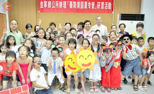 金寧鄉公所連續八年辦理「暑期美語夏令營」,昨日上午十時劃下圓滿句點。鄉長陳成勇參與四十位孩童的成果發表,樂見學童多元豐富的學習成效,他頒獎給十位學習績優學童,感佩家長在暑期和孩子一起學習成長,也相約明年再見。 金寧鄉公所表示,為啟發孩童在輕鬆自然的情況下,學習美語,今年特別聘請雅韻藝術學苑泰德(Shelly Ted)老師授課,自七月二十日起,每週二、四、五上午,帶領四十位國小低年級學童,從活動之中學習基礎美語。 為期二十四小時的暑期美語夏令營,昨日上午十時假金寧鄉圖書館辦理結業式,小朋友分成四組表演歌舞、話劇及歌唱,道具齊全、活潑可愛,現場宛如小型秀場,特別是家長排排坐,仔細觀賞孩子的演出,欣慰滿足的心情全寫在臉上。 金寧鄉鄉長陳成勇也前往和親子同樂,他說,很開心見到四十位幼童於暑假充電學習美語,更感佩家長天天接送與陪伴,親子共同學習成長。感謝公所同仁及老師的努力和辛勞,讓小朋友在快樂、多元、豐富的內容和氣氛中,自然而然學美語。 泰德(Shelly Ted)說,小朋友的表現很棒,而且是漸入佳境,從活動中帶領他們認識語言,減少學習的壓力和陌生感,取而代之的是歡笑和表達能力。