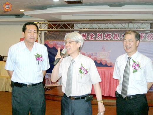 旅台金門鄉親成立的第17個同鄉聯誼會社「桃園縣金烈鄉親公共事務協會」,昨天〈14日〉在桃園縣中壢市新陶芳餐廳,於熱力十足的電音三太子喧鬧歌舞聲中宣布正式成立。創會理事長李寧源許下3年內設立金門會館心願;福建省政府主席薛承泰、金門縣長李沃士等各界貴賓專程到場道賀。 金烈協會成立大會中,用熱鬧的電音三太子大跳「SORRY SORRY舞」及「你是我的花朵」開場,別開生面;與會鄉親辦喜事似的熱絡氣氛,也難得一見。到場祝賀的貴賓冠蓋雲集,包括金門縣長李沃士、地主中壢市長魯明哲、桃園縣議員劉邦鉉、蔣中千等人。 行政院政務委員兼福建省主席薛承泰也在高速公路上塞車兩個小時後趕抵會場,他並臨場以即將動工的金門大橋連結當選理事長的李寧源及金烈協會為靈感,當場以「金門大橋跨烈嶼、寧靜致遠當思源」兩句話,祝賀金烈協會成立及李寧源當選理事長。 甫與薛承泰主席風塵僕僕,拜會新加坡、印尼等地金門僑民會社的李沃士縣長也有感而發表示,當年下南洋打拚的金門同鄉,事業有成後除返鄉蓋番仔樓,也不忘回饋鄉里,捐資興學,譬如這次金門大學掛牌升格,僑領楊忠禮博士就捐款100萬美金,以後還每年出30萬美金為金門大學延聘講師;郭台銘也因楊忠禮引介捐款100萬美金,令人感佩。 李縣長特別提出對旅台同鄉會社的3項心得建議:1.希望同鄉會社能真正凝聚鄉親情感,讓更多鄉親實際參與,給予鄉親更多照顧關懷,不要變了調,或淪為虛無的空殼社團。2.希望各同鄉會社成為匯聚鄉親有關金門縣政建設的窗口,尤其金門現在有相當好的發展契機,需要民間資源的投入,縣政府會建立溝通意見的管道。3.請諸位鄉親時常回家鄉走一走,讓金門鄉親分享各位的成就,也看看金門的發展現況。 當選理事長的李寧源表示,「金烈協會」成立目的在集結鄉親情感、相互關懷、扶持、協助、聯誼及作伙打拚;不為名、也不為利,以金門心、鄉親情,他鄉異地,攜手相連為主要立會精神。他並揭櫫今後3年金烈協會的主要努力目標是成立「桃園金門會館」,讓不少鄉親的夢想成真。 創會主要推手歐陽楠說明金烈鄉親公共事務協會創會源起96年間一群旅居桃園縣的金門鄉親,發起每月一次聚餐聯誼「桃園縣金門鄉親聯誼會」,又名「好吃會」,此後3年鄉親情誼逐漸穩固,而有正式成立協會,及籌建屬於自己的金門會館之議,在徵詢兩位金門縣政府縣政顧問李寧源與楊德和同意之後,始有昨天金烈協會熱鬧成立的場面。 歐陽楠並透露,從小帶著幾百塊錢,告別家人獨自到台灣打天下,從工廠小學徒做起,如今身為玖華金屬公司董事長的楊德和,多年來思鄉思親之情從未稍減,只要聽到鄉親唱起「黃昏的故鄉」這首歌,一定觸景生情,感動淚流。昨天,李縣長陪他與楊太太曾三妹上台合唱「黃昏的故鄉」,楊董事長果然淚流滿面,感動全場。 由於現場氣氛熱烈,李縣長一時興起,難得的展現歌喉,一連唱了「春夏秋冬」、「堅持」兩首歌,後來還與中壢市長魯明哲及李寧源合唱「你是我兄弟」、再與楊德和夫婦等人合唱「黃昏的故鄉」等歌曲,欲罷不能,場面溫馨。 金烈協會選出首屆理監事及會務人員如下:理事長李寧源。副理事長楊德和、蔡水雹。常務理事李錫益、范天佑。理事:翁世章、歐陽楠、林麗芬、李漢亮、王金灶、蔡其庸、洪素珍、楊國安、林博學、楊建雲。常務監事張雲弓。監事:吳金國、許績興、洪國賢、王毓麟。秘書長林長才、副秘書長林顯財、方珠玉。執行長陳松堅、副執行長林長淞。財務長李碧玉。