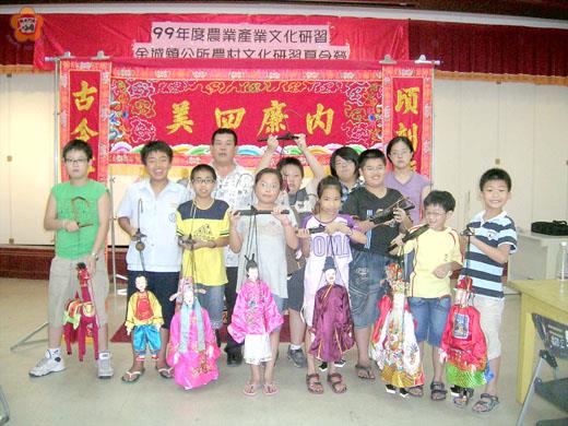 金城鎮公所舉辦地方農業產業文化研習「99年度農村文化研習夏令營」,昨日邀請金門西堡傀儡戲團蔡遠進親身指導兒童傳統傀儡戲操作技巧及體驗,鎮長石兆日指出,傀儡戲不僅是一般的娛樂,同時也兼具表演藝術及宗教信仰的內涵與價值,希望藉由鎮公所舉辦的文化體驗課程,讓更多小朋友認識金門傀儡戲,傳承在地特色文化。 這項由行政院農業委員會指導、金門縣政府輔導,金城鎮公所辦理的「99年度農村文化研習夏令營」,昨日研習課程進行傳統傀儡戲操作技巧及體驗,特別邀請金門西堡傀儡戲團蔡遠進主講金門傳統戲曲傀儡戲及操作技巧體驗。 金門西堡傳統戲曲傀儡戲成立於民國77年,已有22年歷史之久,由蔡甲庚先生所創立,目前由其子蔡遠進接掌戲團,蔡遠進對傀儡戲文化抱持濃烈興趣,也時常到泉州傀儡戲故鄉,尋找老師學習木偶技巧,使各項動作更能表現出完整性及可看性。 石鎮長表示,傀儡戲又稱「嘉禮戲」,早期南部民眾也稱為「大戲」,指的是賓婚嘉會中的大禮。過去婚嫁、壽辰、嬰兒週歲、新建大廈奠基或落成、迎神賽會、謝天酬願,都必須演「嘉禮戲」表示最佳之大禮。傀儡戲除了是民間主要表演娛樂,對於中國戲曲發展也有重要的影響。 蔡遠進表示,金門傀儡戲屬懸絲傀儡,充滿誇張的舞台表演動作,令人印象深刻,傀儡的基本結構分為頭、身體、雙手、雙腳四大部分,身體內部均為竹篾編成的中空身體,以減輕戲偶的重量。傀儡的動作是利用絲線繫在傀儡身體的各關節處。經驗老到的演師,可以靈活操作絲線,輕易做出走路、坐椅、對打、拱手作揖等動作。 對於逐漸式微的傳統技藝,石兆日也期望,透過政府部門的協助推廣,讓更多人了解傀儡戲不僅是一般的娛樂,同時也兼具表演藝術及宗教信仰的內涵與價值,並且希望藉由鎮公所舉辦的文化體驗課程,也讓更多小朋友認識金門傀儡戲,傳承在地特色文化。 此外,因應七夕的到來,研習夏令營也邀請文史工作者楊天厚老師暢談浪漫七夕情人節,並請到製作「七娘亭」已逾40餘年的徐永權師傅教導學童製作簡易七娘亭。