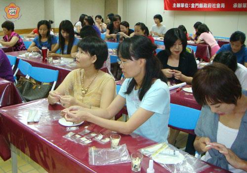 金門縣外籍配偶家庭服務中心,為新移民及二度就業婦女開辦「指甲彩繪」,廣受歡迎,吸引四十七位女性朋友,從學習呵護雙手開始,並在指甲上利用水染、貼鑽等技巧,彩繪繽紛指間,讓整體造型及美麗加分。 金門縣外籍配偶家庭服務中心表示,為協助肩負家庭照顧重擔的新移民婦女和二度就業婦女,重新出發投入職場,繼新娘秘書班之後,開辦指甲彩繪研習,除了協助愛美的女性朋友迎合美甲流行趨勢外,也讓婦女能更美麗,在了解社會發展的趨勢下,為多元的職場做好準備。 該「指甲彩繪」日昨假社會福利館第三會議室舉行,原預計招收三十五人,共擠進四十七人參與,反應相當熱洛,據金門縣外籍配偶家庭表示,有不少年輕媽媽也前來參加,希望能學習最新流行資訊,有機會能二度就業。 四十七位學員,拿起各式工具,埋頭保養雙手,並學習在指甲上或指甲貼片上,從簡單的指甲油上色到水染勾勒、亮片貼鑽等進階技巧,彩繪美甲,讓指間繽紛,整體造型更加美麗,重點是又習得一項技能。金門縣外籍配偶家庭鼓勵學員,有興趣可以專研,並且和新娘秘書所學內容結合,為自己創造美麗、就業和技能三贏。