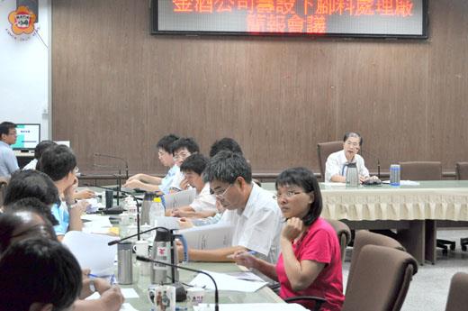 縣長李沃士昨日聽取金酒公司針對籌設下腳料處理廠簡報,對於場址選擇,裁示以國有地的白龍潭出海口旁工業區為優先,並以日產出量二十四噸,預估年產出量八千二百八十噸的方案來處理。 李沃士並指示建設局,未來處理廠建置(預計民國一百年十二月完成)完成後,應協助現有農業使用;而如果將來有機會,產出肥料經認證,並具有競爭力,金酒公司應負責往台灣拓展市場。 簡報昨日下午一時四十分起,在縣政府第三會議室召開,由縣長李沃士主持,主計室主任李秀荷、財政局長黃景舜、建設局長葉媚媚、畜試所所長翁自保、農試所代理所長陳佳結、金酒公司董事長李清正、行政副總經理游鴻程、金門縣農會總幹事黃永堆等與會參加。 金酒公司簡報指出,為有效率並符合環保法令規定,處理釀酒過程中所產生之下腳料,且思考以低生產製造成本,開發金酒公司下腳料附加價值產品,規劃符合環保法令之下腳料處理場,降低對周邊環境、生態之影響。 金酒公司指出,目前公司金城、金寧廠每日污水操作處理後產生八公噸污泥,為符合環保相關法規,目前委託合格機關以事業廢棄物方式處理,每年約需九百萬元之處理費用;並且於等候台金船班期間需於廠區有限空間下貯存,也可能造成廠區環境污染。然而探究金酒公司污水操作產生之污泥,主要為釀酒過程之廢液混凝而成,其成份大多為有機質成份,經以現有法規及污泥成分探討,這些污泥可作為有機質肥料之資材來源,若能有效充分利用,不僅能符合環保法規,且能降低公司營運成本,甚而產出之有機肥可增加公司額外之收入,可說是一舉三得。 金酒公司指出,目前世界潮流有機安全農業興起,而金門的農業未來發展縣政府也規劃定位為安全有機島,由於金門地區土壤養份普遍貧瘠,為改善土壤並確保安全未來勢必需要大量有機肥料,目前地區農業每年有政府補助已逐步開始使用有機肥料,但可能因為成本考量尚未大量使用,未來若釀酒污泥可製作轉化為有機質肥料,可低價售予地區農戶,為地區安全農業增加助力。 金酒公司並指出,有關污泥堆肥之相關處理技術及其產出肥料效果,金門縣建設局及農試所九十七至九十八年委託中興大學進行相關研究及小型實驗試作,目前已獲得初步成果,依研究報告顯示污泥拌和酒糟等資材,經堆積發酵後可產出品質優良之有機質肥料,釀酒污泥製作有機堆肥之技術可行性得到確認,接下來是評估所有廠區產出之污泥及下腳料等大量製作有機堆肥之可行性,因而蒐集相關資訊進行本評估報告。 金酒公司指出,經實際進行訪談調查,金門地區使用肥料,目前每年用量以六千噸估算。而就預估效益分析,規劃設計評估設置堆肥處理場設備,將公司每年產生約二千五百噸污泥及金寧廠五萬一千七百五十噸酒糟有效再利用處理,可減少每年污泥處理費約九百萬元費用,並可產出八千二百八十噸有機肥料(以日產出量二十四噸,預估年產出量八千二百八十噸的方案來處理),並以地區最優惠價格七十五元/二十五公斤計算,可創造約二千四百八十四萬元產值,為金酒公司副產品銷售並解決環境污染問題。
