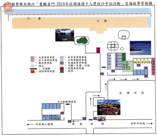因應2010夏豔金門—千人尋找沙中仙活動將於明(六)日下午假后湖海濱公園隆重舉行,為使活動能順利圓滿進行,縣警局將於活動地點后湖海濱公園周邊至東湖路環島南路路口等路段進行交通疏導管制,縣警局提醒參加活動人員、工作人員及行經交管路段附近村莊之民眾配合警察人員之指揮行進,並請參加活動人員將車輛停放至環島南路中心教練場內,搭乘接駁公車前往,或搭乘公共汽車前往,以減少因停車不便所造成之困擾。 縣警局表示,自當日下午二時起至六時止進行交通管制,管制措施如下: 參加活動人員車輛一律由環島南路東湖路路口之道路駛入活動現場,禁止從歐厝村莊駛入會場。惟因應活動需要,環島南路東湖路口至后湖海濱公園停車場路段,屆時管制部分車輛進入,除長官車輛、工作車輛可駛入會場,停放於后湖海濱公園停車場外,其餘車輛一律停放於環島南路中心教練場後,搭乘接駁公車前往會場,並於活動結束後於大型車停車場處搭乘接駁車返回環島南路中心教練場。(接駁車時間:中心教練場最早一班:下午二時三十分發車;后湖海濱公園停車場最晚一班:下午五時三十分發車)。 而參加活動人員之機車可駛入管制路段,並依交通警察指揮停放於所規劃之機車停車區內。大型車可駛入管制路段,並於大型車停車場讓乘客下車後,將車輛駛離停車場,暫停放於中心教練場,俟活動結束後,再駛入會場搭載乘客。 金門縣警察局局長柯昌良表示,后湖海濱公園停車場停車空間有限,請多人共乘一輛車輛前往並將車輛停放於環島南路中心教練場內,搭乘接駁公車前往,或搭乘公共汽車前往,以避免因停車不便所帶來之困擾;另因交通管制所造成后湖、歐厝等村莊民眾行的不便,也在此向村民致歉,並請村民能配合交通警察之指揮,共同促進活動之圓滿順利完成。
