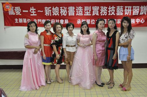 寵愛一生-新娘秘書造型實務班結業,三十五位學員變身成美麗新娘子,並進行成果發展走台步,大膽秀自己,講師李麗明等進行評分,從頭髮、妝容、造型到台風等,最後由洪白巧獲第一名,林秋紅居次,第三名為邱智芬,抱回精美獎品,堪稱活動最大贏家。 由金門縣政府社會局主辦,金門縣外籍配偶家庭服務中心承辦的「寵愛一生-新娘秘書造型實務班活動」,自七月二十日起開課,每星期二至五上午九時至下午三時假社會福利館第二會議室舉行,吸引三十五位居住在金門縣之新移民和二度就業婦女報名參加,提筆彩繪妝容,學習一技之長。 課程從彩妝美容開始,講師李麗明告訴愛美的學員,學會基礎美容美髮後有興興者可投入專研,並能從事與彩妝師、美容師、整體造型設計師、新娘秘書、婚紗攝影服務人員或開設個人工作室等,昨在成果發表會她肯定學員的表現,也鼓勵學員要勤練並且透過證照考試讓自己未來求職加分。 除了彩妝美容外,學員還得在期間學會美髮照型,包括梳髮、編髮、綁髮等造型都要涉獵。有學員形容,課程彷彿短期美容美髮訓練班,內容包羅萬象,不見得樣樣精通,但是樣樣都要學通,才能在最後融會貫通展現成果,更重要的是未來能跟職場結合。 昨日上午九時進行最後成果發表會,學員準時出席打點自己,有人拿出結婚時的禮服,有人穿旗袍,有人走俏皮路線,還有小朋友被打伴成小花童,現場宛如婚禮會場,豔光四射。經過兩個小時的準備,人人化身美麗的新娘子,依序走台步一較高下,最後有洪白巧奪冠,第二名為林秋紅,第三名是邱智芬。