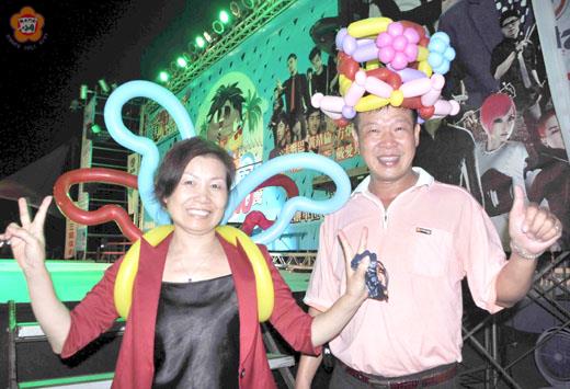 張建騰/圖文 氣球帽,出風頭! 花蛤季活動中,金湖鎮長蔡西湖、民政局長翁伸金頭戴氣球做成的造型帽,大出風頭。