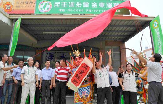 民進黨金門縣黨部金東服務處於昨天揭牌成立。 民進黨金東服務處址設金湖鎮新湖里漁村107號,由黨部副執行長洪海水出任服務處主任。 昨天的揭牌典禮是由民進黨金門縣黨部主委翁明志、民進黨全國黨代表陳滄江主持,並由翁明志授旗給洪海水。 昨天在場觀禮人員有蔡西湖(金湖鎮長)、陳文顧(新湖里里長)、陳水德(金湖鎮代表)、林長鴻(金湖鎮代表)、黃秀珍(立委陳福海服務處主任)、吳增允、蔡福祿、董水倫、盧志吉、陳昆南、許永面……等。 翁明志表示,他曾參選三次立委、兩次議員,都想於當選後在金東成立服務處,卻沒有機會;如今,他是縣黨部主委,希望藉著金東服務處的成立,擴大服務,紮根金東地區。 他表示,民進黨在金門會本著勤政、清廉、愛鄉土的信念提供服務,希望鄉親不要嫌棄。 蔡西湖表示,不管選不選舉,服務要不分黨派,盡量做;民之所欲,就要去拚!他肯定翁明志為金門打拚的精神。黃秀珍則認為民進黨在金門向來是言別人不敢言,做別人不敢做的事。 陳滄江則表示要繼續走對的路,做對的事;他說:別人不敢說的,由我們來說;別人不敢做的,由我們來做!