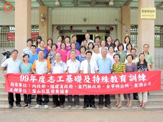 金寧鄉九十九年志工基礎及特殊教育訓練活動,告一段落,鄉長陳成勇親自頒發結業證書,鼓勵志工伙伴落實於日常的服務工作中,以更專業的志工服務,讓受扶助的鄉親得到更完善的照顧,感受到政府的溫暖關懷。 該項志工基礎及特殊教育訓練,利用週六、週日到鄉公所四樓視廳室上課,持續三週時間,安排社會局社會工作師楊蕙禎、國立金門技術學院學務長董燊、運動休閒系副教授胡巧欣、林本源講授和志工分享「志願服務的內涵」、「志願服務發展趨勢」等課程。 鄉長陳成勇在結業儀式中,頒發結業證書予受訓的志工伙伴,肯定他們這一段時間,用心的學習有關志工服務的專業知識,也分享服務的經驗。 陳成勇很高興志工伙伴們有始有終的完成各項學習課程,讓自己充實專業的技能,有滿滿的收穫。陳成勇也勉勵志工們有了技能,更重要的是要落實於日常的服務工作,讓受關懷的對象享受到更好的服務。陳成勇說,志工在第一線做服務工作,如同政府伸出的關懷雙手,也是政府服務民眾的縮影,他希望透由研習活動,充實志工的專業技能,也凝聚志工的向心力和情感,歡喜做志工,有「施比受更幸福」的感受。