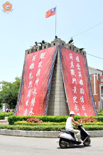 楊水詠/圖文 今年七月二十六日是「大二膽戰役六十週年」,為迎接大捷紀念日來到,烈嶼指揮部除整修和粉刷烈嶼軍人公墓之外,昨天在八達樓子掛起兩幅大型布縵,上頭分別寫著:「感念英雄胸懷日月,英勇戰鬥青史永載」及「戰役精神永傳承,英雄先烈萬世揚」激昂振奮的字句,希望軍民共同追憶戰史,緬懷當年國軍將士的英勇事蹟。