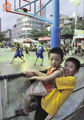 張建騰/圖文 就讀國小四年級的吳旻鴻,抱著尚未讀幼稚園的弟弟吳鴻均觀看金湖盃的決賽。吳旻鴻表示,他想在中場參加投籃,看能不能得到一顆籃球。 為了增加參與的樂趣,決賽的中場休息時間,金湖鎮公所會舉辦三分球投籃活動;投中了就可以得到一顆籃球當獎品。 這項投籃活動,金湖鎮公所、金湖鎮代會各提供了四十個球、鐵腳金門刀提供了五十個籃球。