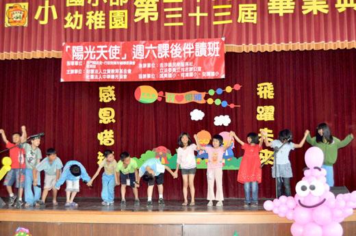 「陽光天使」週六課後伴讀活動昨日舉行溫馨的結業式,二十多位接受輔導的小朋友開心展示十三週來學習的成果與成效,活動中學生大秀舞蹈、話劇與展示陶藝、砂畫等創作才藝,展現孩子豐碩的學習成果,最後學童也獻花感謝陪伴他們成長的大哥哥、大姊姊志工,氣氛相當溫馨。 這項結業式於昨日上午九時三十分假何浦國小學生活動中心舉行,包括金城鎮長石兆 、財團法人立賢教育基金會執行長王馨敏、社團法人中華曙光協會理事長林政緯、何浦國小校長李國安、安瀾國小校長張秋沐、金沙民眾服務社總幹事李應文、民伯陶藝空間吳惠民、後浦商圈發展協會理事長周浯斌等人都到場參與。 活動一開始首先由「陽光天使」志工帶領小朋友穿越氣球拱門,接受來賓與志工的祝福,志工隊隊長蔡浩祥也透過投影片,帶領來賓回顧細數學童們十三週來學習的成果,看到過往的點點滴滴,很多小朋友都感動的眼眶泛紅。 王馨敏在致詞時表示,經過這十三週不同的課程與遊戲,相信孩子們都在不斷的成長中,希望這段時間的點滴,會是學童在學習過程中最珍貴的回憶,她也特別感謝志工、校長們的協助,讓活動可以圓滿落幕。 李國安很感謝財團法人立賢教育基金會、社團法人中華曙光協會兩個協會的協助,幫忙金沙地區的弱勢學生進行課業輔導,他也提及,該校的目標學生約佔七分之一,學生都很優秀,但很多學生的家長因為要工作,無暇給予他們照顧跟陪伴,這些志工的陪伴,給了孩子們很多啟發,他特別代表校方與家長表達感謝之意。 張秋沐表示,該校的目標學生更多,約有三分之一,原本學校有開辦夜光天使,現則有陽光天使接棒,幫忙照料學童,最後他也勉勵孩子要感恩惜福,發揮自己的亮點與優勢,期盼往後大家都能成為耀眼的星星,幫助需要幫助的人。 「你們快樂嗎?」石兆 昨以此句當開場白,他說,聽了校長們的致詞,發現金門的弱勢族群教育還有很多改進的空間,他說,這與金門環境的改變,年輕人口外移、外配、陸配增加有關,他也感謝校長對教育的用心與執著,讓孩子們都可以快樂的學習與成長。 昨日的學童成果展,學童們陸續上台表演「合唱--快樂天堂」、「熱舞表演—no body、妳是我的花朵」、「話劇表演—三隻小豬」等,現場歡笑聲、掌聲不斷,氣氛相當HIGH。 王馨敏還特別為孩子們邀請台灣知名的「無獨有偶劇團」表演皮影戲,大受小朋友的歡迎,很多學童還上台學習如何表演,大呼好好玩! 此外,也由來賓輪番頒發結業證書、表現優良獎項、全勤乖寶寶獎項、陽光少男獎項、陽光少女獎項等獎,最後,還安排學童獻花感謝志工與師長,現場氣氛感人。 財團法人立賢教育基金會表示,有鑑於金沙學區地區偏遠,相對資源少,推動「陽光天使」週六課後伴讀活動,由大學生義務性利用星期六時間,為何浦、安瀾、述美等校二十多位弱勢學童加強課後輔導,並運用在地資源規劃各類才藝、團康活動,提供平常沒有的學習機會,以期能縮減學習落差並有效提昇基本知能。