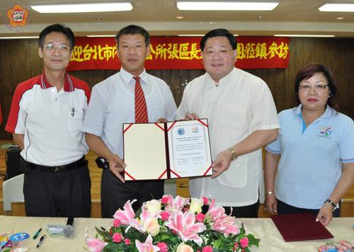 台北市內湖區公所區長張金鎮,昨日率二十人團隊到金湖鎮作客,宣導二O一O台北國際花卉博覽會,受到金湖鎮公所及代表會的歡迎。雙方簽署締結友好城鄉關係共同聲明,互贈紀念品為友誼搭起橋樑。張金鎮力邀金門鄉親組團看花博,透過活動增進觀光交流,創造雙贏,也見證國人傑出的園藝和花卉產業。 台北市內湖區公所,由區長張金鎮、里長聯誼會會長陳尤雪、農會理事長謝建華、內湖社大教師張允翰等及里長代表等一行二十人,昨起抵金展開為期三天的鄉鎮參訪行程,首站抵達金湖鎮公所,受到鎮長蔡西湖、代表會主席呂瑞泰率隊熱烈相迎。 雙方禮貌性介紹和致詞並互贈紀念品為彼此友誼搭起橋樑。蔡西湖表示,期待兩地未來透過更多的活動互相切磋,增進瞭解。 張金鎮表示,首次到訪金門感到新奇,再次來到金門看到金門的進步;即將於九十九年十一月六日登場的「二O一O台北國際花卉博覽會」,展期維持至一百年四月二十五日,這是台灣第一次正式獲得國際授權舉辦的國際級園藝博覽會,會場面積高達九十一點八公頃,佔地約七十五點四公頃。涵蓋圓山公園區、美術公園區、新生公園區、大佳河濱公園區,展區包括台北市立美術館、台北故事館、中山足球場等六座新建場館共十四座展覽館,呈現花卉園藝實力、文化藝術特色、環境永續關懷、先端科技成就等四大特點,歡迎金門鄉親組團前往參與,一同見證台灣傑出的園藝與花卉產業能力躍上國際舞台。 台北市內湖區公所一行抵金將參訪金城鎮、明將赴烈嶼鄉參訪,下午三時起將在金門高中辦理一場次藝術演出,由內湖社區大學吉他老師張允翰、羅飛雄老師分別表演佛朗明哥吉他演唱和魔術秀,預計於下午五時三十分搭機賦歸,結束三天兩夜的參訪行程。