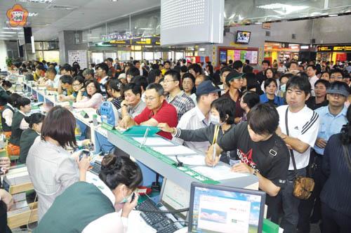 尚義機場昨日上午雖然恢復空運,空軍運輸機也投入疏運行列,但是下午過後,由於天氣不佳影響,造成載客量較多的噴射機型客機及支援疏運的空軍C-130H運輸機被迫停擺,台金航線僅靠螺旋槳小客機支撐,形成一位難求,旅客擠爆機場航站大廳,金門航空站為維持航站秩序,晚上七時也開設聯合補位單一窗口,旅客大排長龍登記補位,民營的「金門快輪」也將於今日上午8時由金門開往台中港,加入海運,一起輸運滯金的旅客。 十三日下午的氣候轉變,濃霧影響到台金空運,讓許多返鄉投票的鄉親以及來金旅遊或大陸中轉的觀光客動彈不得,逾1000名旅客「無機可乘」,許多旅客還夜宿機場,等待候補機位。 昨日一早,立榮、華信和復興三家航空公司的櫃台擠滿候補機位的人潮,還有民眾因候補的順序,發生爭吵,航警出面維持秩序。 空軍C-130H運輸機也加入輸運行列,一趟輸運七十名旅客,在僧多粥少的情況下,擠爆航站大廳的旅客,難掩焦躁的情緒,要求航空公司再加班,讓他們順利回到台灣。 上午的氣候,三家航空公司的班機和軍機都順利起降,輸運旅客,下午一時過後,由於天氣不佳影響,噴射機型客機和空軍C-130H運輸機無法降落尚義機場,只得返回台灣,各航空公司紛取消表訂的噴射機型客機,改飛螺旋槳小客機,讓整個輸運受到影響,金門航空站也於下午邀集金防部、空軍金門基地勤務隊、金門縣政府等單位協調疏運作業,決定比照春節模式,採取空海兩路疏運計畫。 金門航空站表示,昨日表訂的台金航線四十一班班機,取消十四班,臨時加開十班的小客機,立榮最後一班班機,於晚間十時十五分順利飛返高雄。