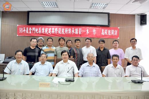 薪火相傳!「金門地區傳統建築修復技術傳承講習木作高級班」,昨舉行開訓及敬師儀式,金門籍4位藝生依古禮向師傅敬師與獻茶,並正式展開為期十個月木作專業訓練,也象徵了金門傳統文化延續一個新的里程碑。 木作高級班開訓、敬師儀式昨下午2時假縣府第三會議室舉行,由主秘盧志輝主持,他嘉勉4位中青年朋友投入木作學習領域與學習精神。文化局長李錫隆、建設局長李增財,匠師李清海、建華營造股份有限公司王林斌等等均出席盛會。 敬師儀式中,依古禮舉行,首由學徒呂凌吉、張志強、王家進及莊文雅等四位,依序上台向木作匠師張志忠獻茶,學徒一句句懇切:「師傅,請用茶!」,令木作匠師張志忠當場感動不已,儀式簡單隆重,現場見證及觀禮的貴賓均報予熱烈掌聲。 盧志輝指出,金門縣的傳統閩南建築聚落為金門縣獨有的文化資產及觀光的重要特色,深具保存價值。金門重要資產的維護,需要具有專業技能的匠師參與維護,為保存並傳承金門地區傳統建築修復技術。 金門縣政府特擬定了「金門縣維護傳統建築風貌工作計畫」,將培育金門地區傳統建築修復匠師列為主要重點,期盼透過專業匠師的培訓技術,讓金門匠師能生根發展,且建立正確古蹟修復觀念與修復技術。 由行政院文化建設委員會與金門縣政府共同主辦,中國科技大學文化資產研究中心承辦的「金門地區傳統建築修復技術傳承講習木作高級班」的匠師培訓,特別延聘金門地區傳統大木匠師張志忠擔任傳藝教師,擁有32年豐富木作經驗,技術精湛,口碑良好。 「師父引進門,修行在個人」,在縣府苦心規劃培訓及延聘專業的木匠師,目前從事匠師工作4位中青年人,在未來10個月向張師傅學習傳統大木技藝,包括材料、工具、工法等。課程包括木通、斗櫸、三通五爪、門窗、寸白等等工地實作,結合實務與理論為一。 這項木作高級班開訓,也是延續今年3月份泥作班後所開立另一訓練班,另外後續的「金門地區傳統建築修復技術傳承講習-現職匠師研習」亦將於99年6月19日~7月31日開訓,相關訊息詳參閱中國科技大學文化資產研究中心網站(http://ccnt1.cute.edu.tw/cprc/)。