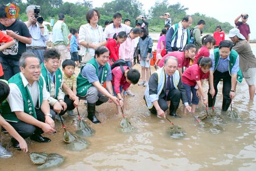 金門縣水產試驗所昨日一大早在古寧頭鱟保育區,進行放流三十對成鱟及十萬餘尾稚鱟,進行生態復育,期盼有灘地活化石之譽的「鱟」,能在金門海域生生不息。 放流活動昨日上午八時起,在古寧頭鱟保育區的北山出海口舉行,由金門縣政府主任秘書盧志輝、縣議會議長王再生、金門國家公園管理處處長曾偉宏、縣府建設局長李增財、水試所所長王漢文、金寧鄉長陳成勇、代表會主席李正騰等,帶領古寧國小、金寧中小學、桃園縣民營諾瓦國小學生二百多人參與生態保育工作。 議長王再生和縣府主秘盧志輝於分別致詞時,也以小時候經常在海岸邊都能看到鱟的蹤跡,但因人為破壞棲地,加上海洋環境受污染,以致鱟的數量明顯減少,是希望透過鱟的放流,喚起大家對環境保育意識更加重視,並共同來維護海洋資源的避免被破壞。 而來自台灣的諾瓦國小三十名學生,是到金門進行國家公園教學活動,適逢放流鱟活動,首度觸摸像鋼盔般的海中生物,並且放流入海,大家十分興奮,為金門行留下難忘回憶。 根據金門縣水試所資料,「鱟」為海洋底棲性無脊椎動物,又稱做「馬蹄蟹」,其祖先早在四億年前出現,二億年前演化為現今型態,因此,動物學界譽為「灘地上活化石」,由於外形像鋼盔、又是雌雄成對出現,因此,暱稱為「鋼盔魚」、「鴛鴦魚」。 水試所所長王漢文指出,「鱟」為棲地生態指標動物,台灣西海岸相當少見,金門也有棲地破壞之虞,因此,金門縣政府於一九九九年底依漁業法公告古寧頭海域八百公頃的範圍做為鱟的保育區,進行鱟的禁捕、保育工作,水試所並進行復育與保育研究,以維護生態資源。 而水試所昨日放流的鱟,計有成鱟三十對,二齡稚鱟十萬餘尾,為確實了解鱟的族群變動與移動狀態,特別於放流成鱟的外殼標幟編號,鱟尾也有標示,藉此追蹤其洄游路徑,了解鱟的生長狀態,進而研擬加強保育作為。